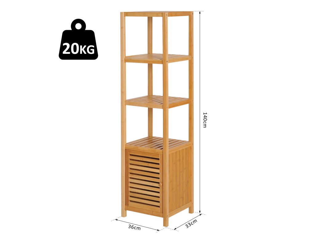 Tato koupelnová police kombinuje styl a funkčnost a vytváří krásné úložné řešení, které se dokonale hodí do vaší koupelny. Díky svému štíhlému a vysokému designu se snadno vejde i do menších prostor. Disponuje třemi prostornými otevřenými policemi a spodní přihrádkou ve skříňce, které splňují všechny vaše úložné potřeby.