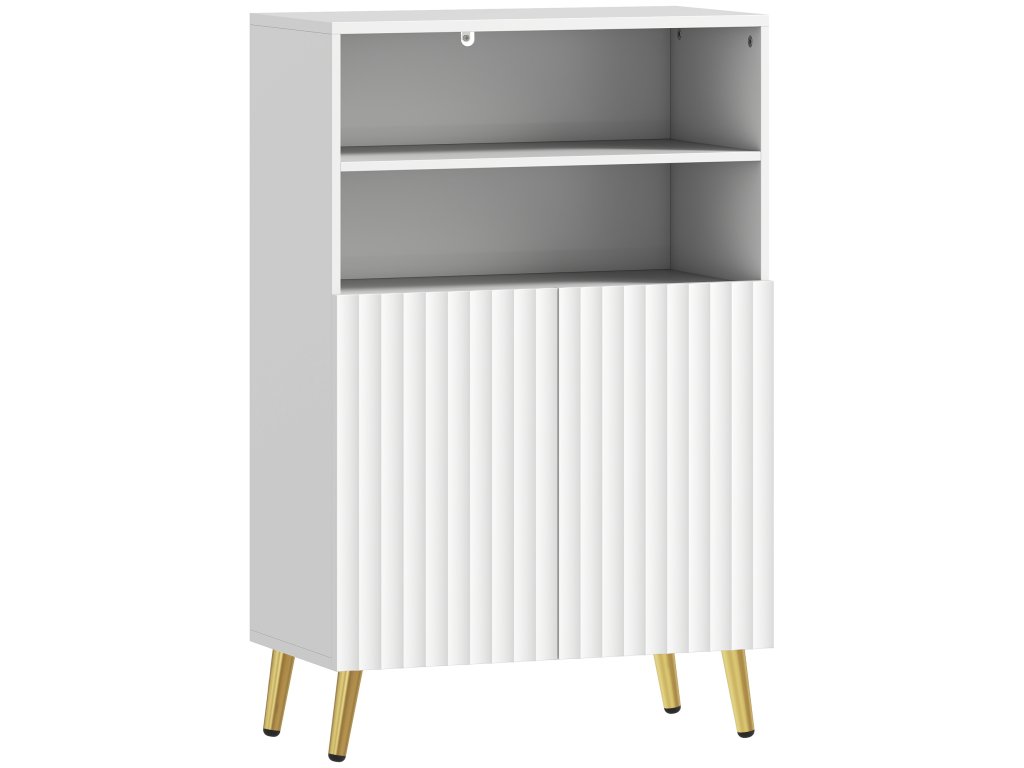 Žebrovaná elegance: S unikátně zakřivenými drážkovanými dvířky, doplněnými zářivě bílou povrchovou úpravou a zlatými akcenty, zužující se nohy pro elegantní, moderní styl. Design bez úchytek vytváří minimalistický vzhled.