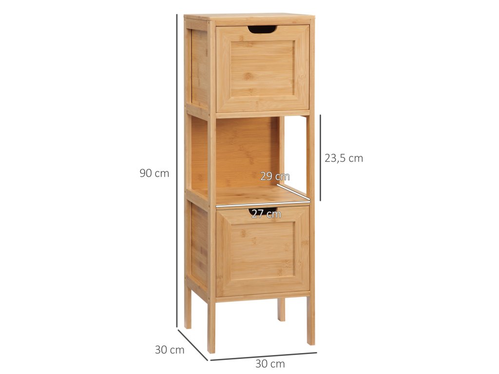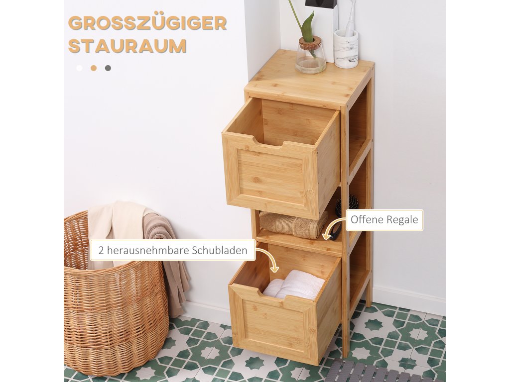 Maximalizujte prostor a minimalizujte nepořádek s touto moderní koupelnovou skříňkou. Toto nápadné úložné řešení do koupelny vám pomůže vytvořit pořádek ve vaší domácnosti. Kombinace otevřených polic a zásuvek je ideální pro menší prostory, kde je organizace klíčová. Tato volně stojící koupelnová skříňka je vyrobena z odolného bambusu a má přirozený vzhled pro každodenní použití.
