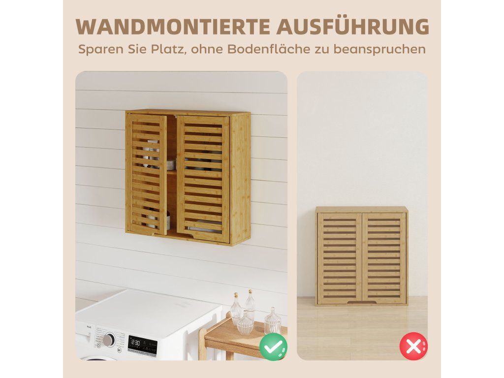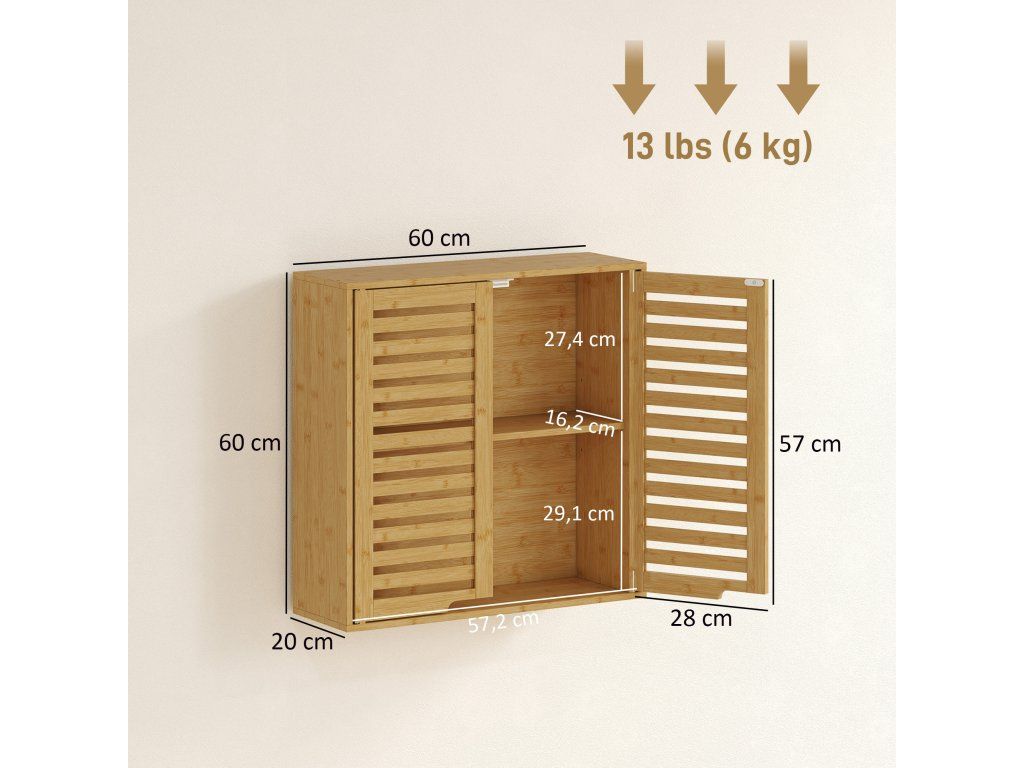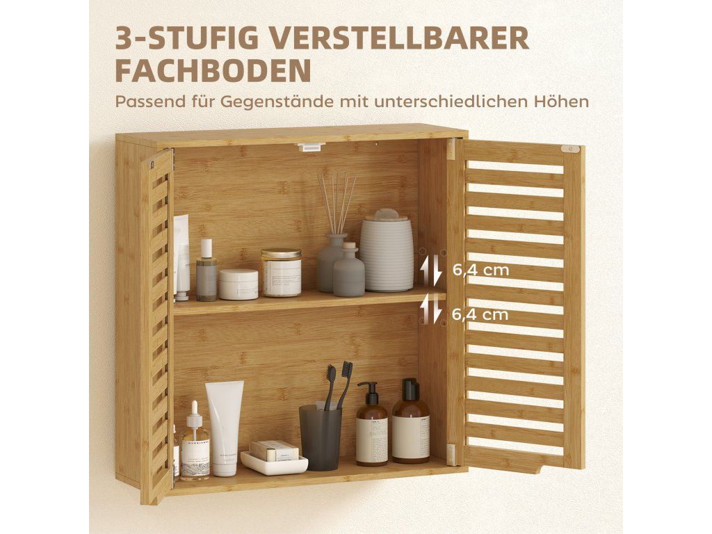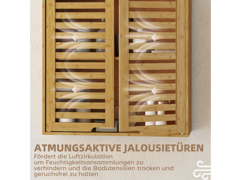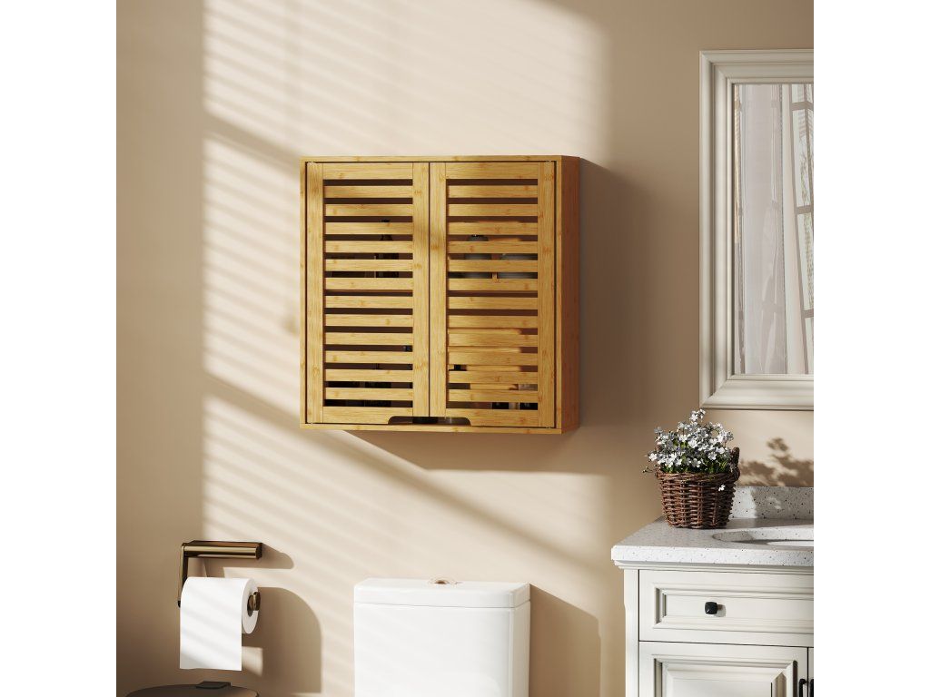 Proměňte svou koupelnu s koupelnovou nástěnnou skříňkou s prodyšnými lamelovými dvířky, které udrží vaše produkty čerstvé a suché. Nastavitelná třípatrová police snadno pojme toaletní potřeby jakékoli velikosti a udrží vše uspořádané. Tato bambusová skříňka, kterou lze jednoduše namontovat nad toaletu nebo umyvadlo, optimálně využívá vertikální prostor a kombinuje přírodní eleganci s funkčním úložným prostorem.