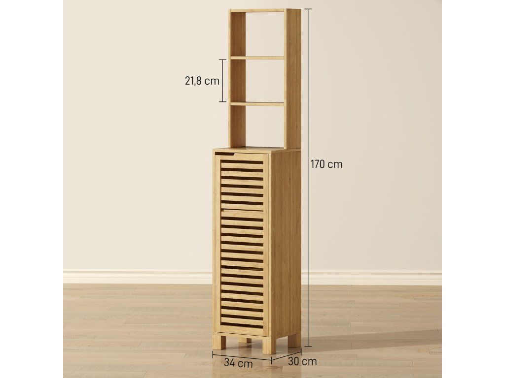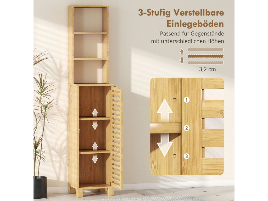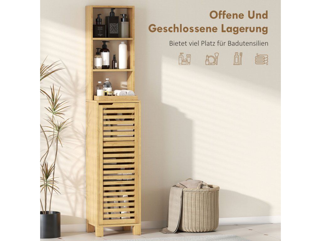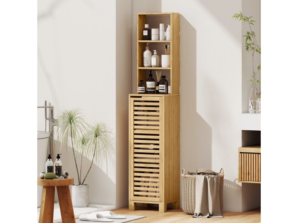 Už vás nebaví chaotická koupelna, která vám ráno dělá výzvu? Neustálý nepořádek a strach z převrácení věcí mohou ve vašem soukromém prostoru vyvolat pocit stísněnosti. Vysoká koupelnová skříňka přináší zpět klid a pohodu díky otevřeným a přizpůsobitelným úložným řešením. Tato úložná skříňka je vyrobena z přírodního bambusu a je vybavena sadou proti převrácení pro bezpečnost rodiny a podporuje klid a pořádek ve vašem každodenním životě.