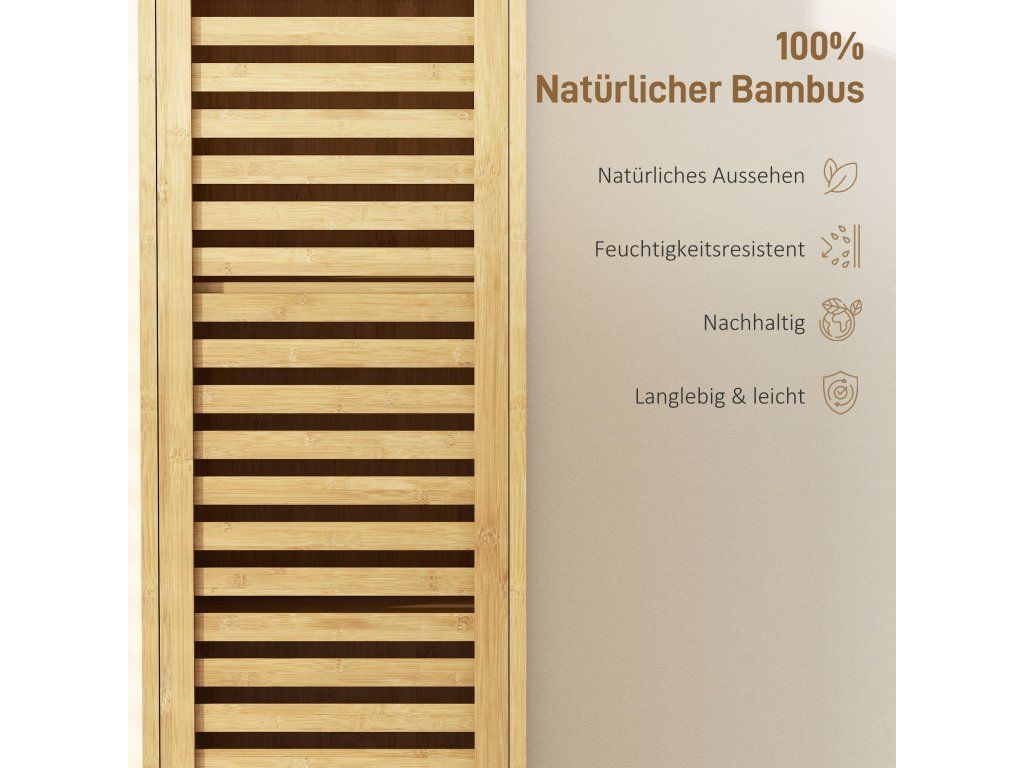 Bambusový rám: Tato vysoká, víceúčelová skříňka vyrobená z robustního bambusu je přirozeně pevná a odolná vůči vlhkosti – ideální do vlhkého prostředí. Lakovaná povrchová úprava poskytuje dodatečnou ochranu proti vodě a vlhkosti a zajišťuje tak dlouhodobé používání.