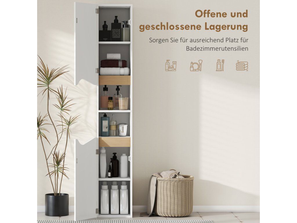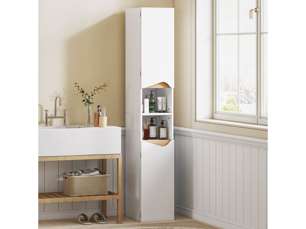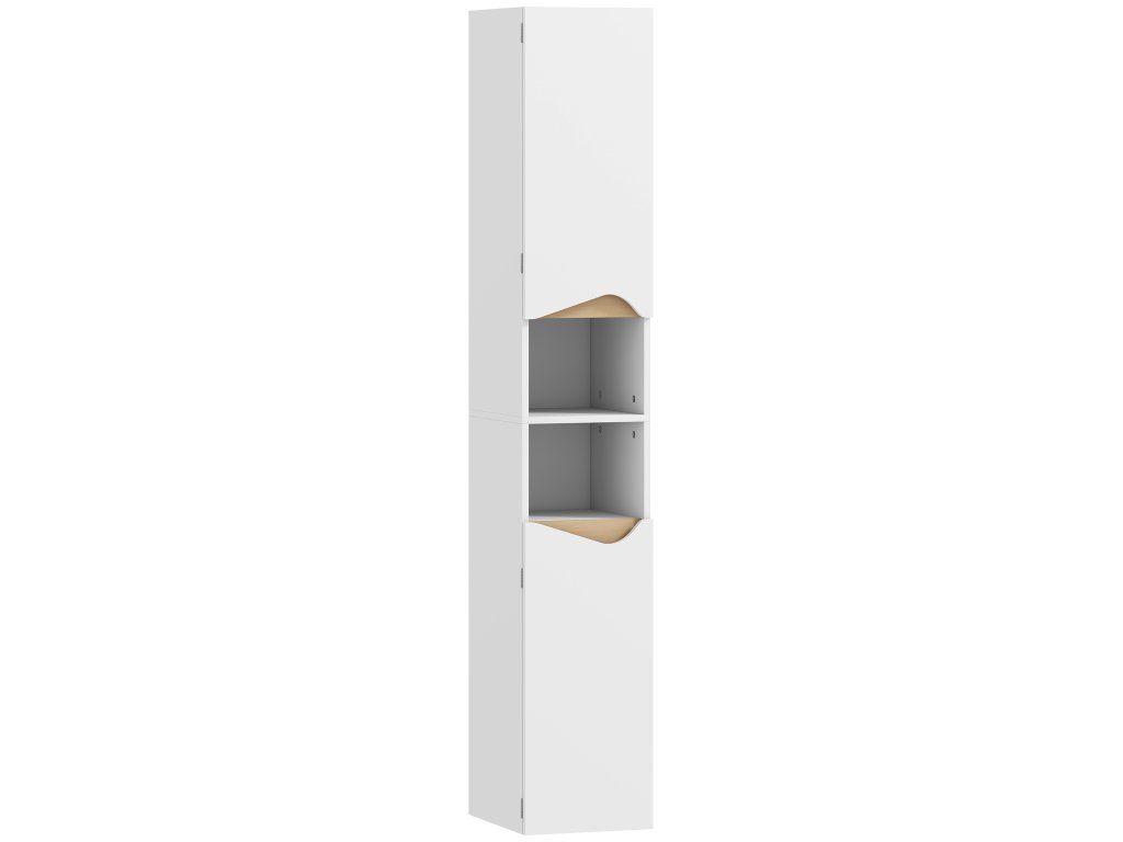 Už vás nebaví nepořádek v koupelně, který vám ráno mění v chaos? Poloprázdné lahve a ručníky všude způsobují, že malé prostory působí ještě menším dojmem. Vysoká koupelnová skříňka s rozdělenými úložnými přihrádkami a nastavitelnými policemi vnese do vaší koupelny pořádek a pojme větší předměty. Svěží bílá a teplé dřevěné tóny skříňky promění váš prostor v klidnou oázu a obohatí váš každodenní režim.