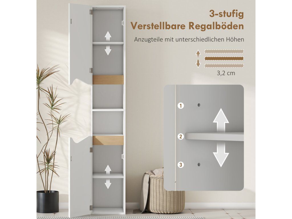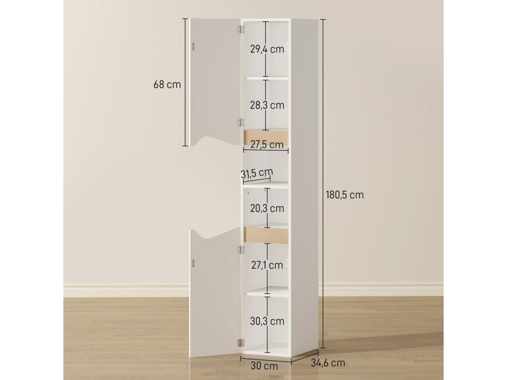 Úsporný štíhlý profil: S rozměry 30 x 34,6 x 180,5 cm se tato úzká vysoká skříňka bez problémů vejde do malých výklenků a poskytne tak další úložný prostor v koupelnách pro hosty, chodbách nebo malých bytech, aniž by zabírala cenný prostor.