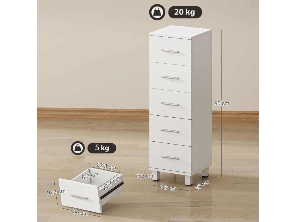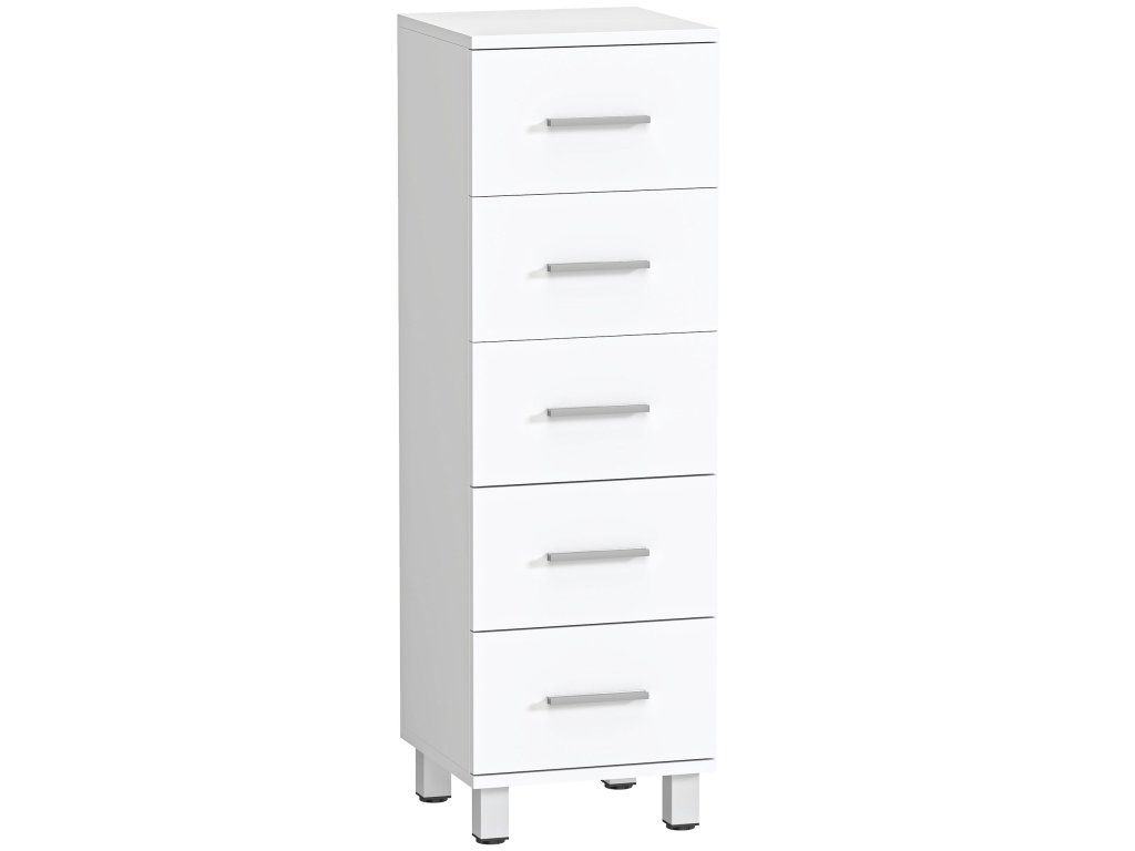 Koupelnová skříňka je vaším tichým pomocníkem, když vás přemůže nepořádek. Toaletní potřeby se hromadí, ručníky mizí a povrchy vypadají přeplněné. S pěti hladce se vysouvajícími zásuvkami tato skříňka přináší pořádek a udržuje vše po ruce. Elegantní bílý design úložné skříňky se stříbrnými úchyty dodá vaší koupelně klidnou a svěží atmosféru, která vám každý den přinese radost.