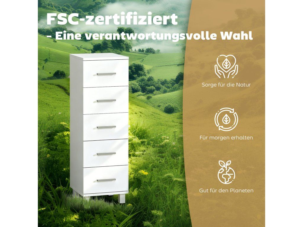 Odolná a snadno se čistí: Tato koupelnová skříňka je vyrobena z dřevotřísky s certifikací FSC a má snadno čistitelný melaminový povrch. Lze ji otřít rychlým otřením, což nabízí odolné a ekologické řešení pro váš domov.