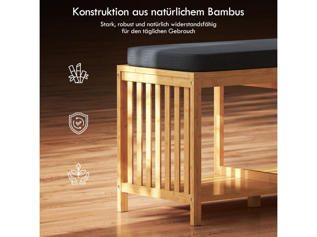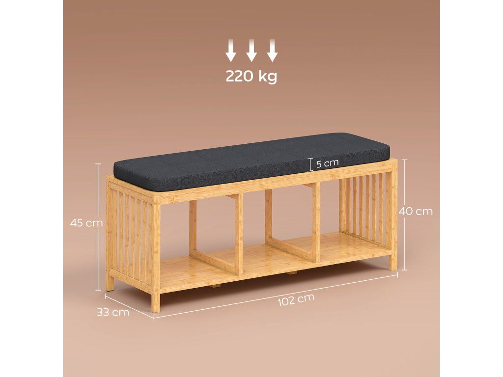 Stabilní bambusová lavice: Robustní a odolný bambus unese až 220 kg. Stabilní sedák a laťkový design botníku s lavičkou větrají boty a redukují zápach – ideální pro každodenní použití.