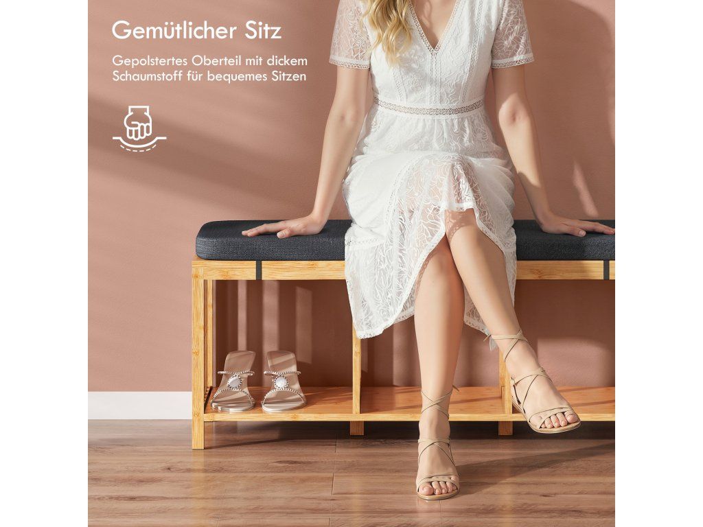 Elegantní a všestranný design: Bambusový povrch a čisté linie dodávají botníku elegantní vzhled, který doplní předsíň nebo ložnici a zanechá trvalý pozitivní dojem.