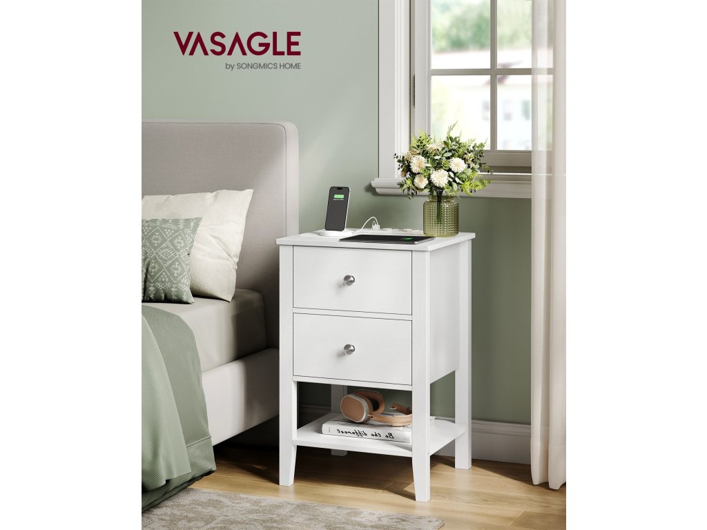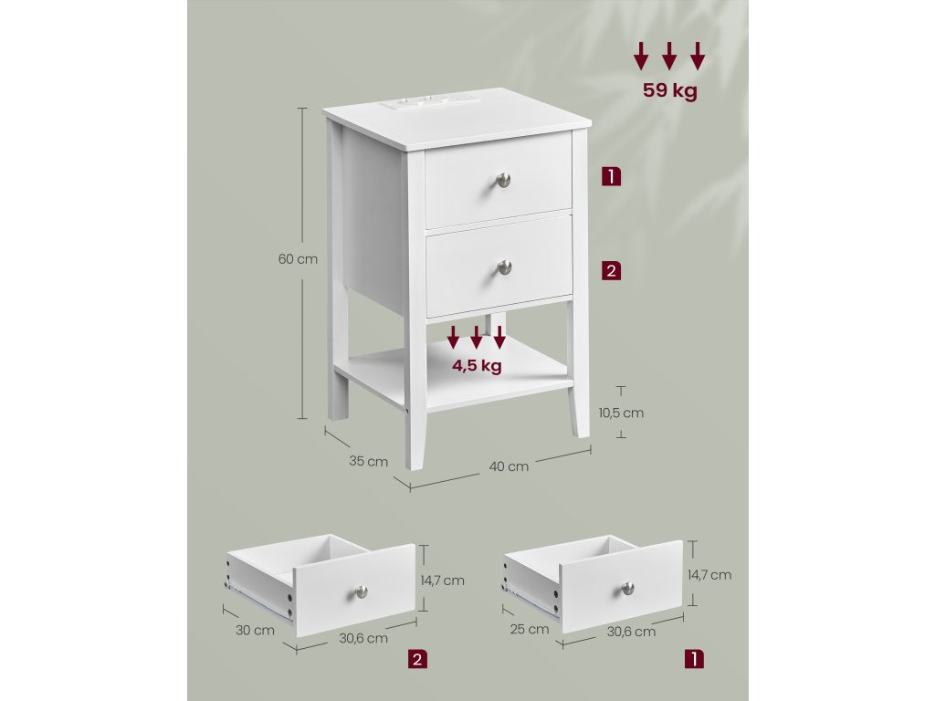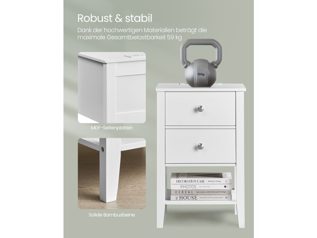 Tloušťka bambusu Díky nohám a desce stolu z přírodního bambusu je tento noční stolek mimořádně robustní a odolný. Deska stolu unese až 100 kg a každá zásuvka a police až 10 kg.Snadné nabíjení S tímto postranním stolkem se 2 zásuvkami a 2 porty USB-A můžete pohodlně nabíjet více zařízení v posteli nebo na pohovce. Už žádné problémy s nedostupnými zásuvkami nebo zauzlovanými kabely.Minimalismus a elegance Díky svým čistým liniím a bílé barvě je rozkládací stolek "méně je více". Vyzařuje nadčasový šarm a bez problémů se hodí do každé místnosti, ať už jde o ložnici, obývací pokoj nebo jiné malé místnosti.Dostatek úložného prostoru S velkou deskou stolu pro vaše lampy nebo dekorace, 2 uzavřenými zásuvkami pro ukrytí vašich soukromých věcí a otevřenou policí pro vaše knihy. tento noční stolek vnese do vaší domácnosti pořádek a pohodlí.Snadná údržba a montáž Tento konferenční stolek se díky voděodolnému lakovanému povrchu snadno čistí - stačí jej otřít vlhkým hadříkem! Díky označeným dílům a srozumitelnému návodu (čeština není zaručena). montáž je také hračka| Kategorie: | Noční stolky |