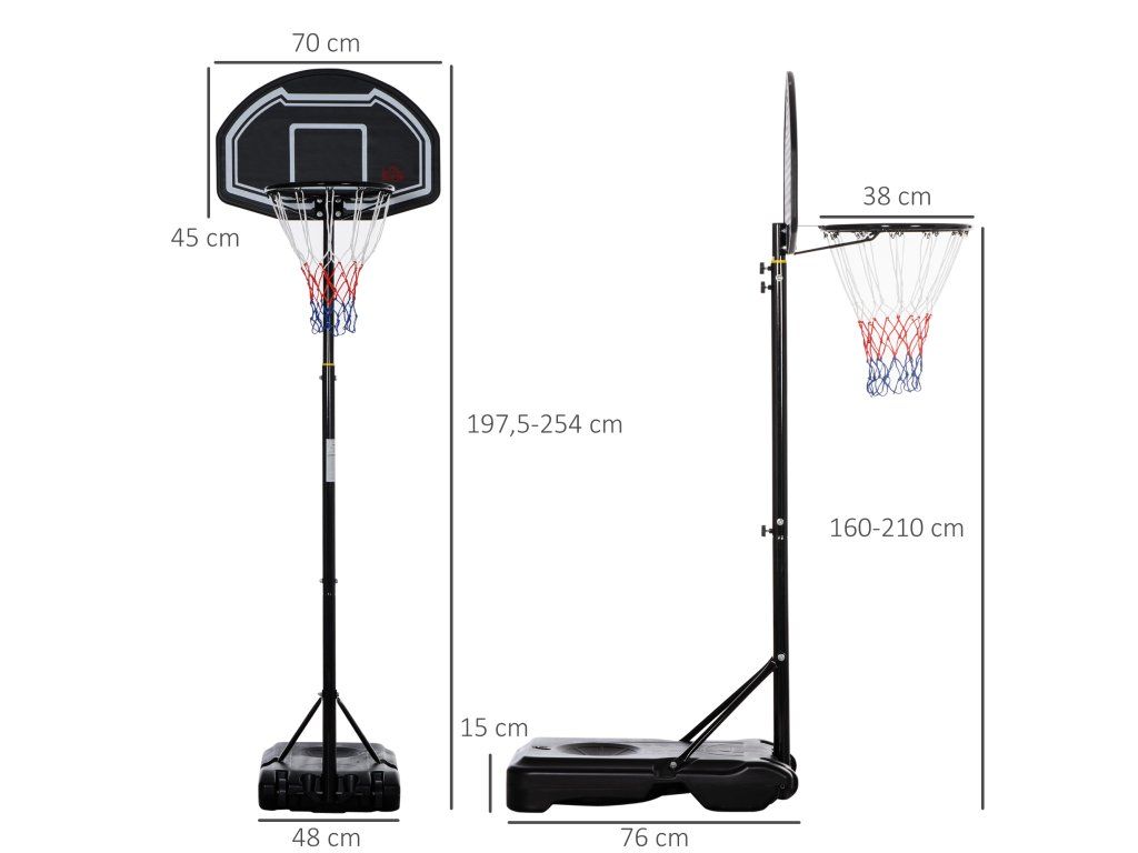 ✔ Deska: 70 x 2 x 45 cm. Celková výška: 197,5-254 cm. Obruč basketbalového koše: 160-210 cm. Základna: 76 x 48 x 15 cm