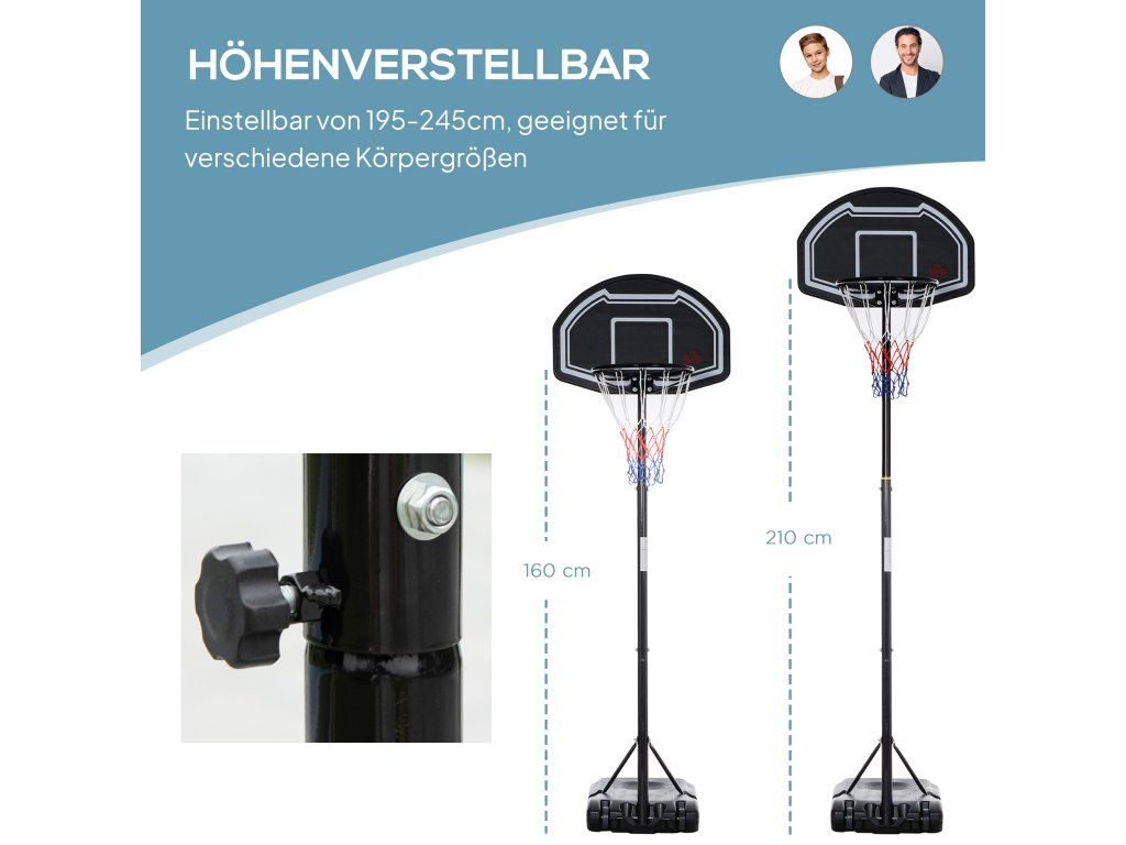 Zažijte zábavu z basketbalu s venkovním basketbalovým košem. Robustní ocelový rám je výškově nastavitelný od 197,5 do 245 cm – ideální pro různé výšky a věkové skupiny. Samotný basketbalový koš lze nastavit od 160 do 210 cm. Velkou základnu lze pro větší stabilitu naplnit vodou nebo pískem. Díky dvěma kolečkům a držáku na míč vzadu zůstává míč bezpečně uchycen a snadno dosažitelný.
