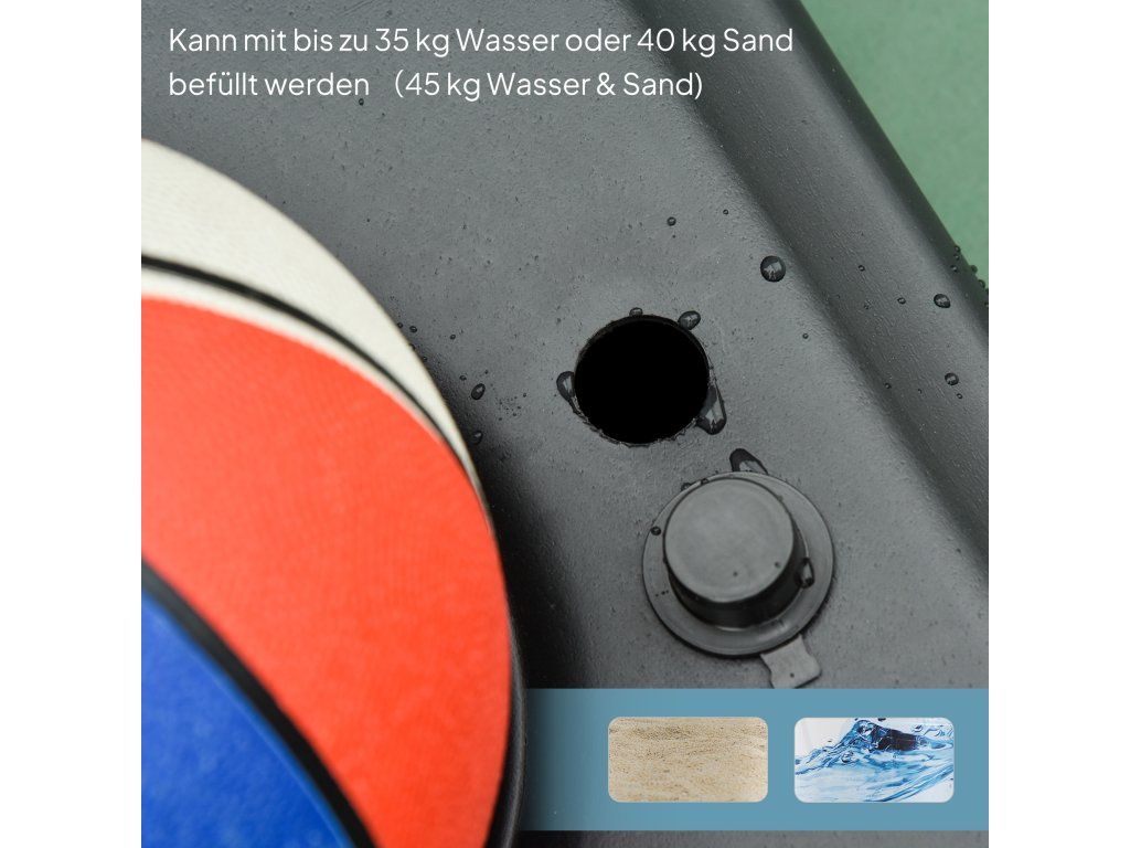 Stabilní základna: Základnu lze naplnit pískem nebo vodou, aby basketbalový koš bezpečně a stabilně stál na zemi. Použijte 35 kg vody, 40 kg písku nebo 45 kg směsi vody a písku. Základna je také vybavena praktickým držákem míče, který ho bezpečně udrží, když se nepoužívá.