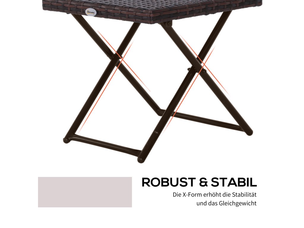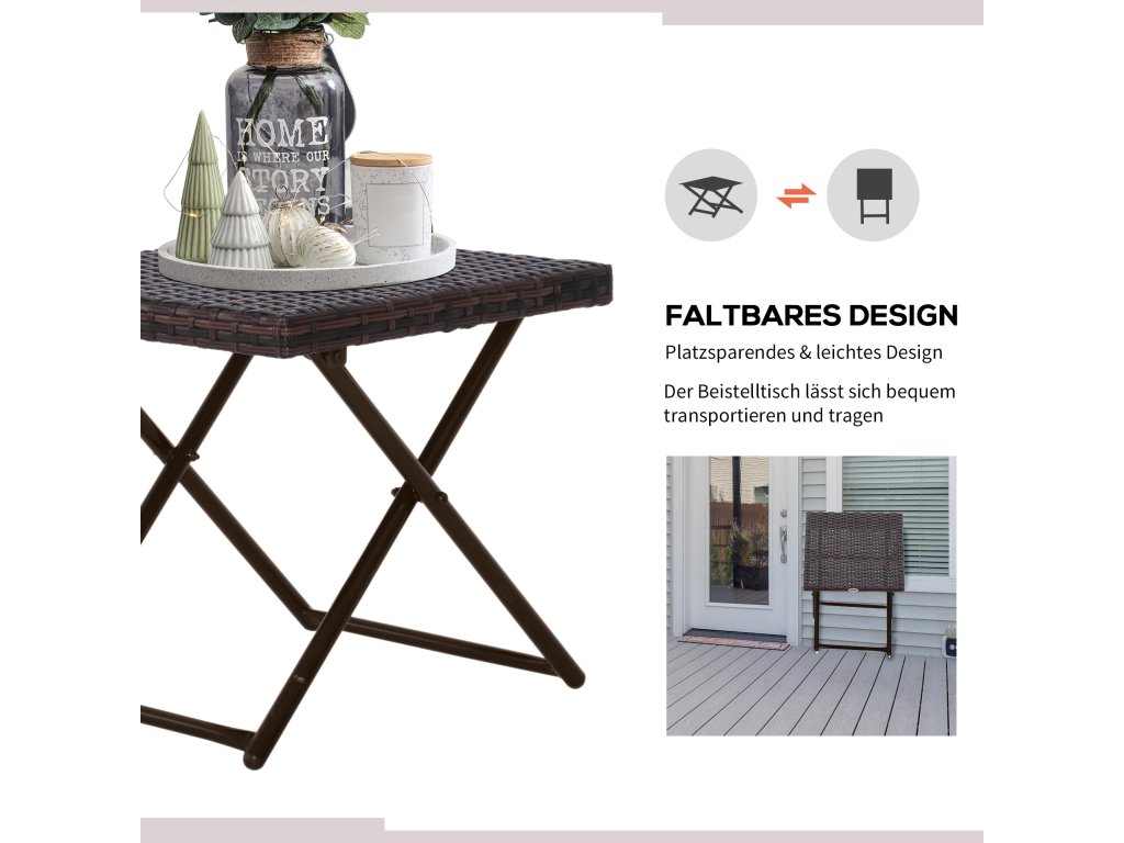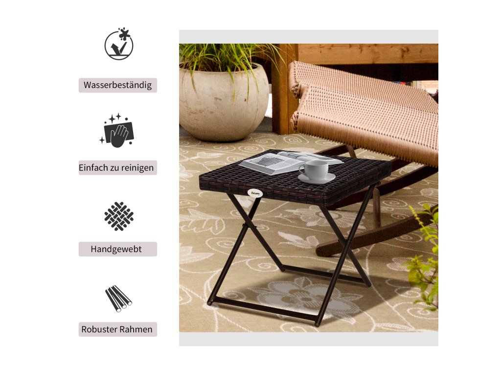 Vylepšete si atmosféru své zahrady a terasy tímto moderním skládacím stolem s vysoce kvalitním ratanovým vzhledem a mějte svou oblíbenou knihu a teplý nápoj po ruce při relaxaci venku. Robustní ocelový rám a polyratanová deska se snadno čistí, takže odkládací stolek může sloužit i jako dekorativní stojan na vaše rostliny. Díky skládacím nohám lze zahradní stůl snadno přepravovat a skladovat, čímž ušetříte místo.