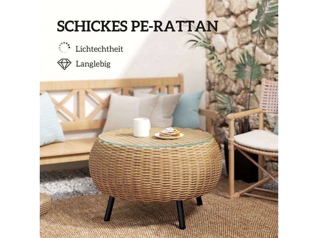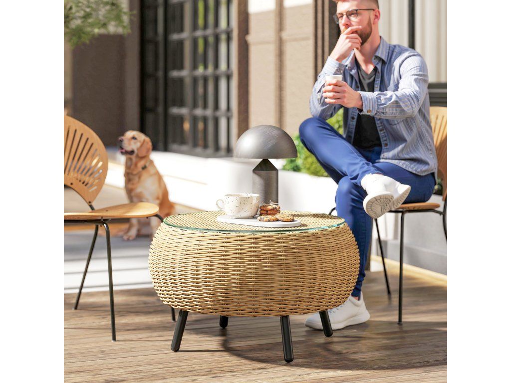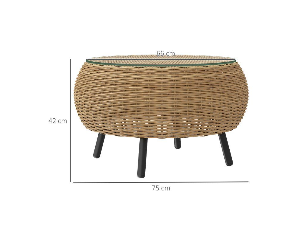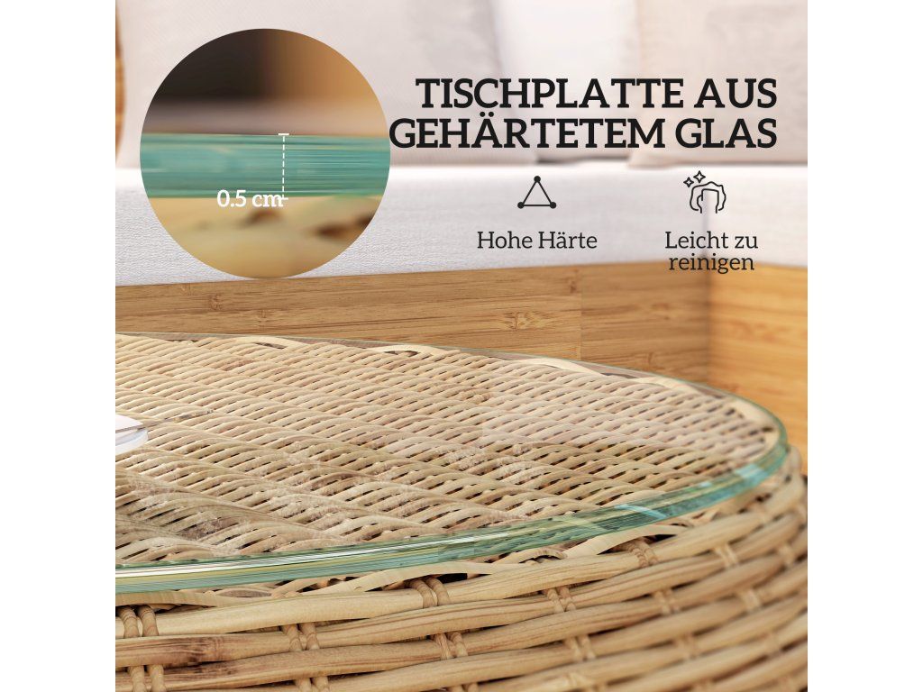 Deska z tvrzeného skla: Tento ratanový stolek je vybaven 0,5 cm silnou deskou z tvrzeného skla a poskytuje pevný a bezpečný povrch, který se snadno čistí – ideální pro použití uvnitř i venku.
