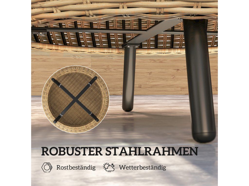 PE ratan odolný vůči povětrnostním vlivům: Tento kempingový stůl je vyroben z půlkulatého PE ratanu, který lze používat po celý rok, a je zvláště odolný proti vyblednutí a široké škále povětrnostních podmínek, díky čemuž je trvalým zvýrazněním vaší terasy.