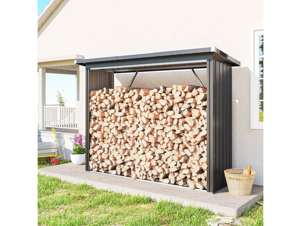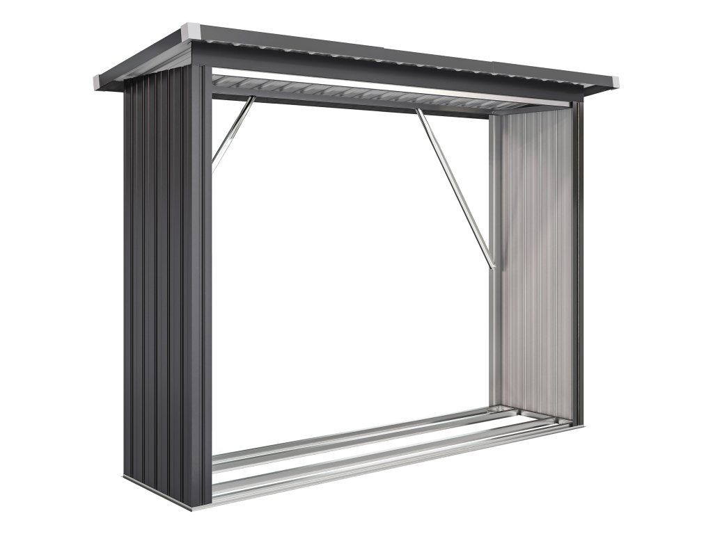 Udržujte své palivové dřevo suché a připravené do krbu v přístřešku na dřevo! Dřevník má vyvýšenou podlahu pro optimalizaci cirkulace vzduchu a robustní ocelový rám s výztužnými tyčemi. Šikmá střecha z vlnitého plechu účinně odvádí dešťovou vodu a chrání dřevo před vlhkostí. Ideální pro organizované a snadno přístupné venkovní skladování.