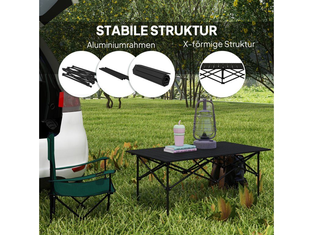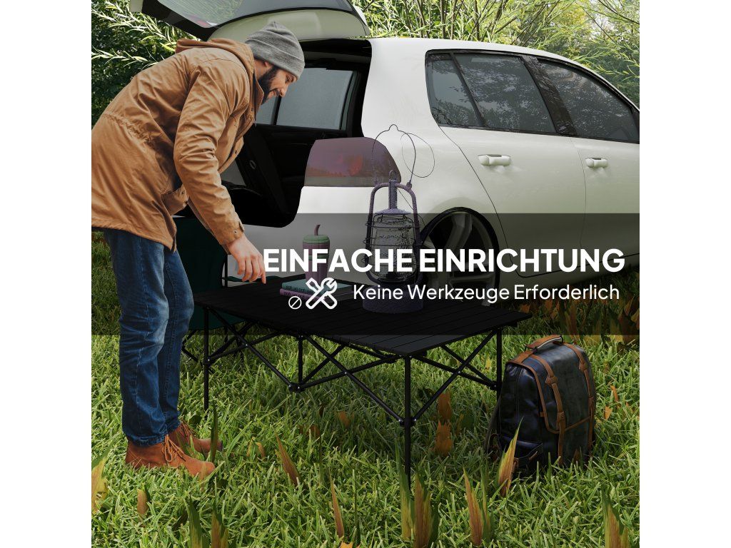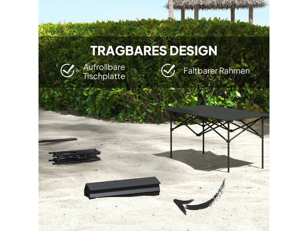 Snadno přenosný design: Tento kempingový stůl se skládá z rolovací desky stolu a skládacího rámu a je ideální na cesty – ideální pro outdoorové aktivity a dobrodružství.