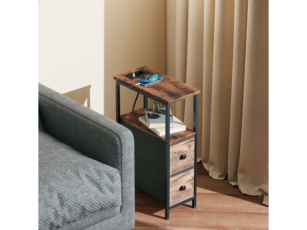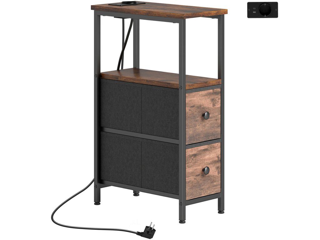 Vyzkoušejte praktický odkládací stolek s vestavěnou nabíjecí stanicí, včetně zásuvky, portů USB a USB-C. Pohodlně nabíjejte svá zařízení. Dvě látkové zásuvky, otevřená přihrádka a horní police udržují věci uspořádané, to vše zabalené v industriálním stylu, který dodává malým prostorům zvláštní kouzlo.
