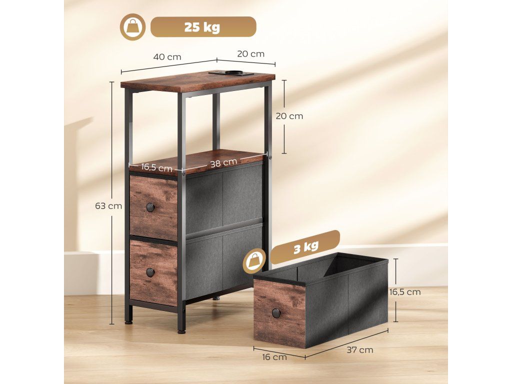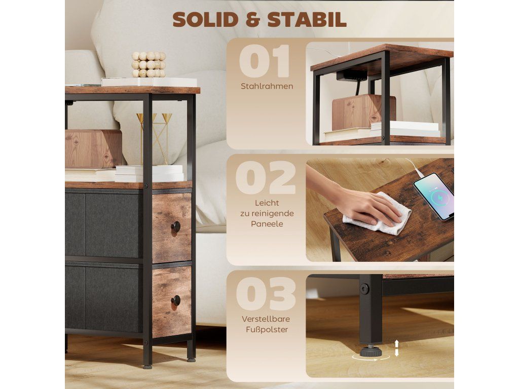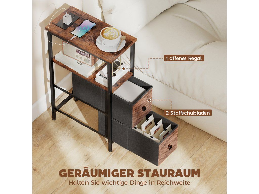 Praktické řešení pro uložení: Tento odkládací stolek má dvě látkové zásuvky, otevřenou přihrádku a poličku pro úhledné uložení knih, dálkových ovladačů, kávy nebo osobních věcí, a udrží tak váš obytný prostor uklizený a organizovaný.