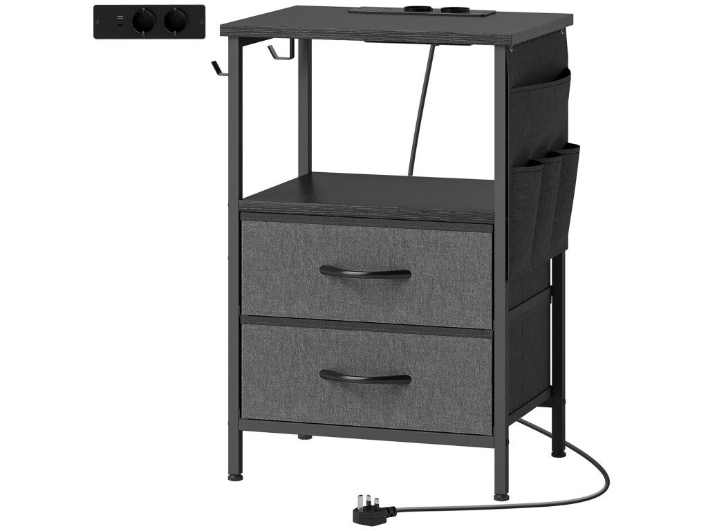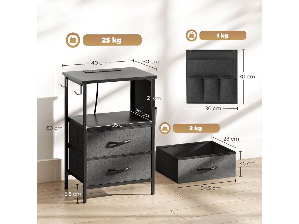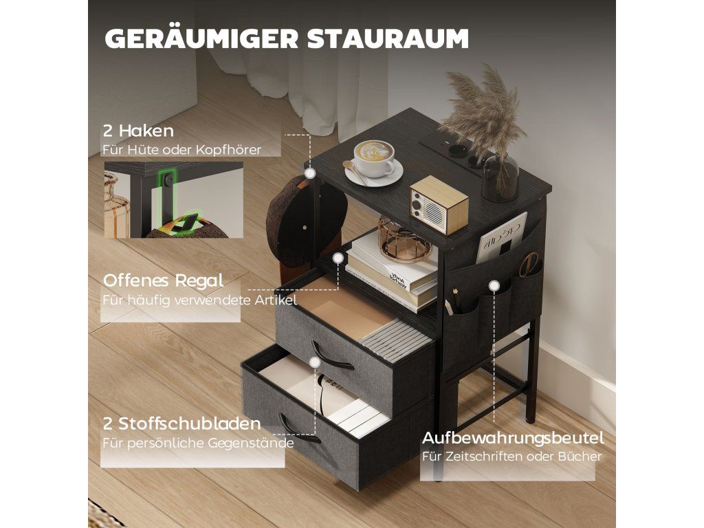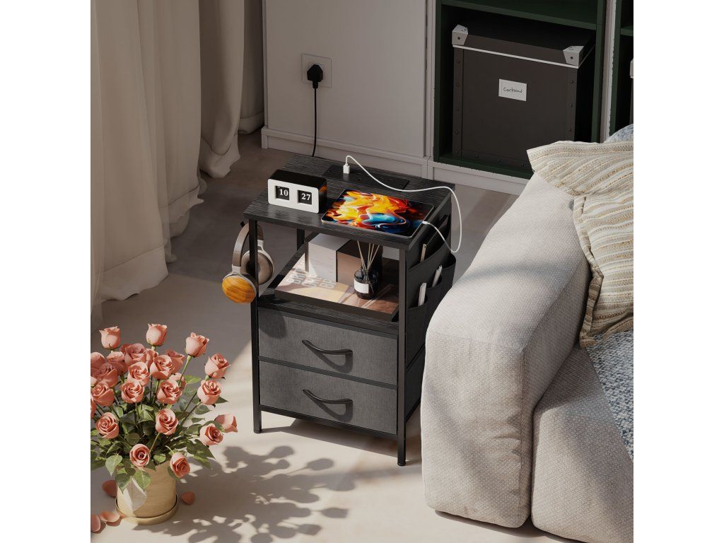 Řešení úložného prostoru pět v jednom: Tento kompaktní odkládací stolek nabízí desku stolu, otevřenou polici, dvě látkové zásuvky, úložný sáček a háčky pro uložení knih, elektroniky a každodenních nezbytností uspořádaných a uklizených.