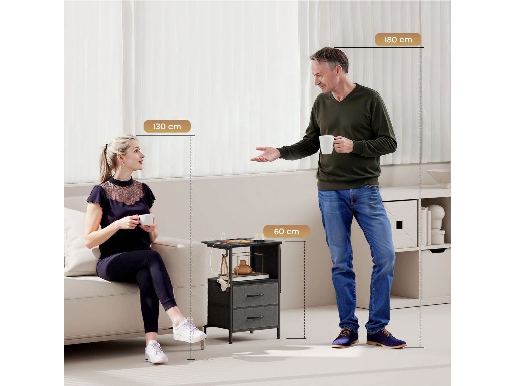 Zamotané kabely a nepořádek narušují váš večerní režim a ztěžují skutečnou relaxaci. Představte si, že se vašim zařízením přes noc dojde energie a vše důležité zůstane rozházené po místnosti. Odkládací stolek s úložným prostorem přináší zpět pořádek díky integrovaným zásuvkám a USB portům, které vám umožní zůstat ve spojení. Jeho pětidílný úložný systém, včetně zásuvek a praktické boční kapsy, poskytuje vyhrazený prostor pro všechno.
