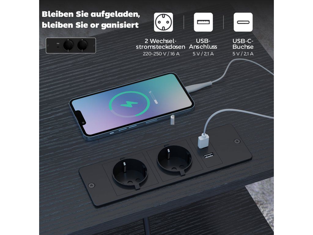 Integrovaná napájecí lišta: Udržujte své malé stolní příslušenství nabité pomocí dvou AC zásuvek a portů USB-A a USB-C, takže máte své telefony a zařízení vždy po ruce, když relaxujete.