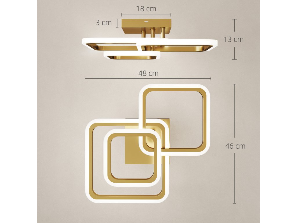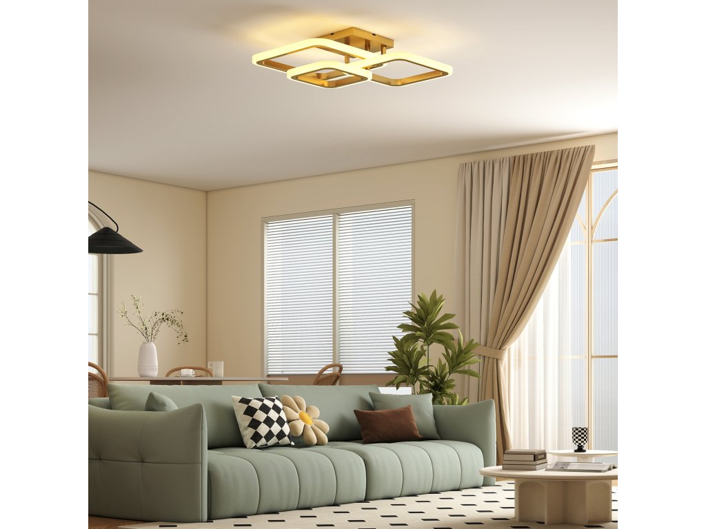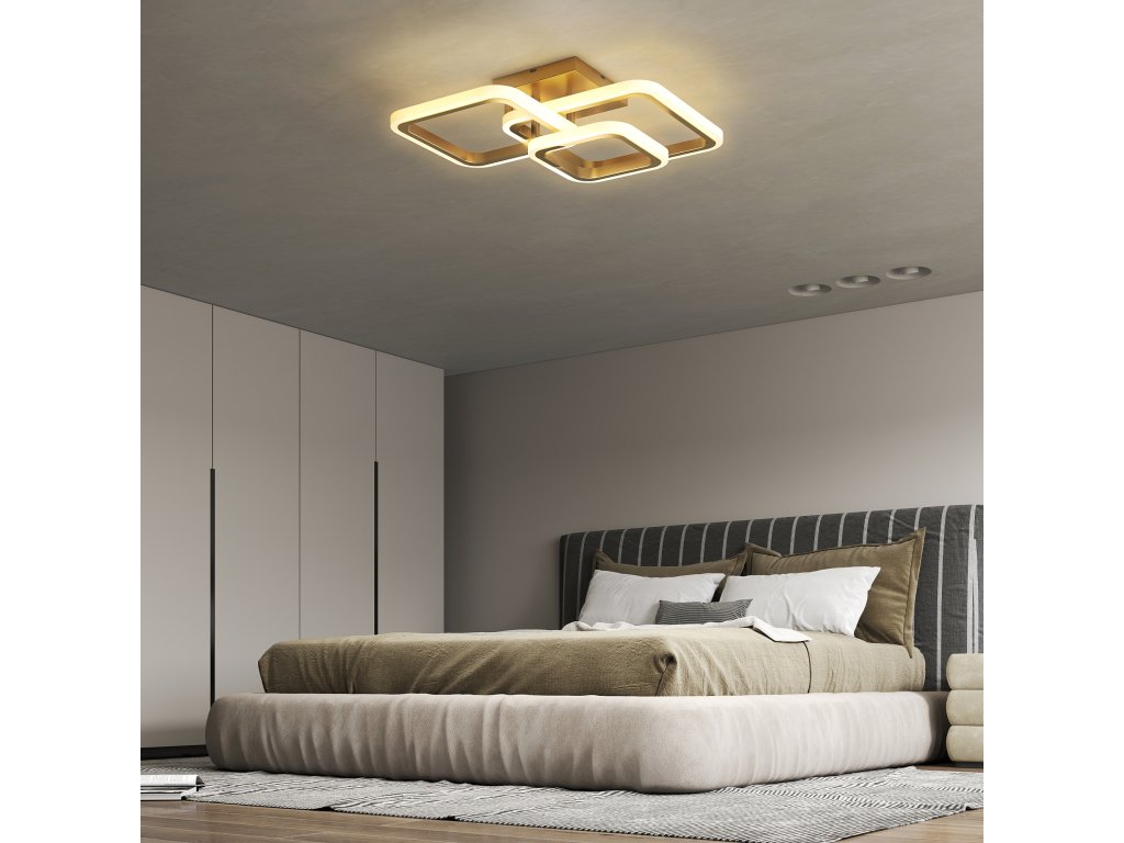 ✔ Stropní svítidlo do ložnice má tři zlaté čtvercové kroužky, které dodávají moderní a umělecký nádech.