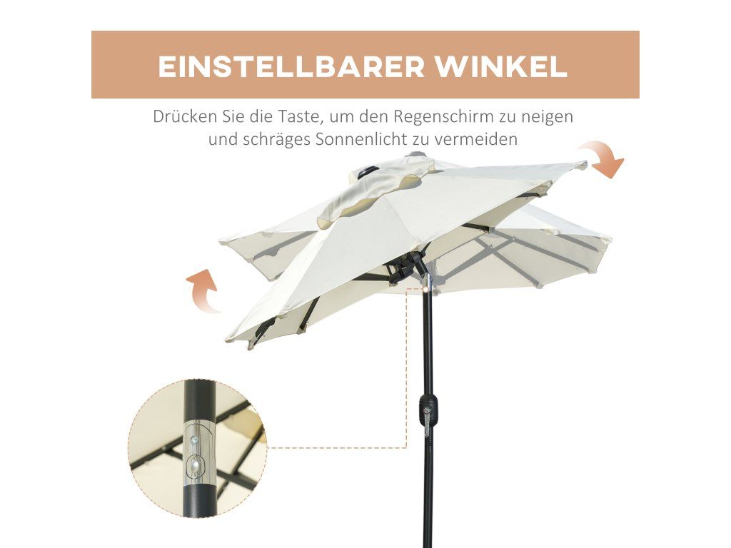 LED solární světla: Tento slunečník vás nejen chrání před sluncem, ale také ukládá energii pro noční osvětlení. Každé žebro má řadu LED diod napájených vestavěným solárním panelem. Solární panel během dne absorbuje sluneční energii a ukládá ji do baterie. To vám šetří elektřinu a umožňuje vám pohodlně sedět na terase i po západu slunce.