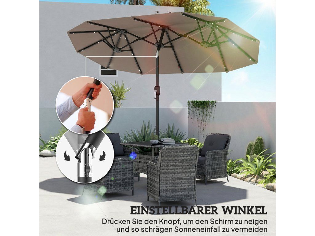 Rádi si čtete venku nebo piknikujete v letním vánku? Tento velký dvojitý slunečník nejenže chrání vaše hosty a zahradní nábytek před sluncem, ale také jej lze naklonit a podle potřeby nastavit stín. Solární panel se během dne nabíjí a poskytuje dostatek energie pro integrovaná LED světla, takže vaše zahradní párty může nerušeně pokračovat i po západu slunce. Léto je tady!