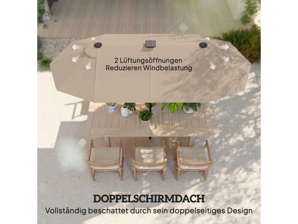 Určeno pro venkovní použití: Tento dvojitý slunečník je vybaven větracími otvory, polyesterem odolným proti roztržení a robustním 12žebrovým ocelovým rámem pro stabilitu a dlouhou životnost ve větrném počasí.