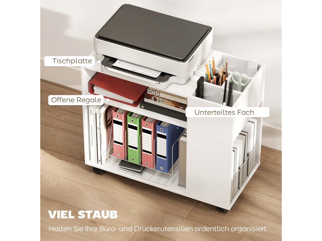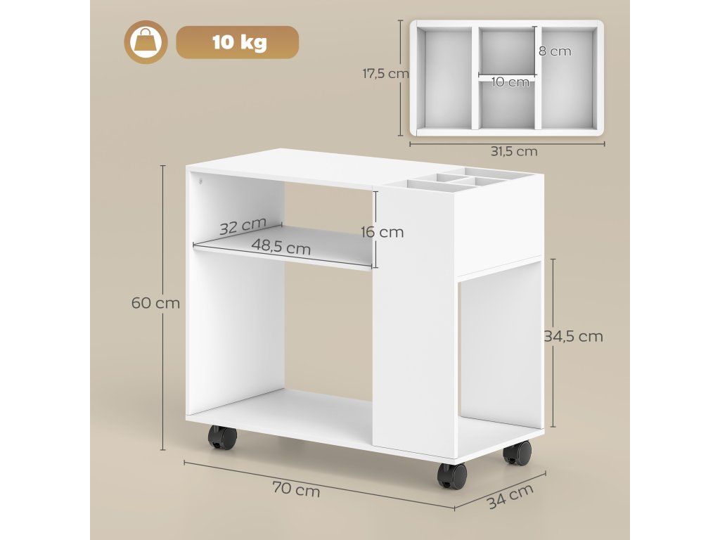 Kompaktní a stylový design: Tento elegantní bílý stojan na tiskárnu s rozměry 70 x 34 x 60 cm je perfektním doplňkem většiny stolů. Jeho moderní a čistý styl se bez problémů hodí do každé domácí kanceláře, pracovny nebo obývacího prostoru.