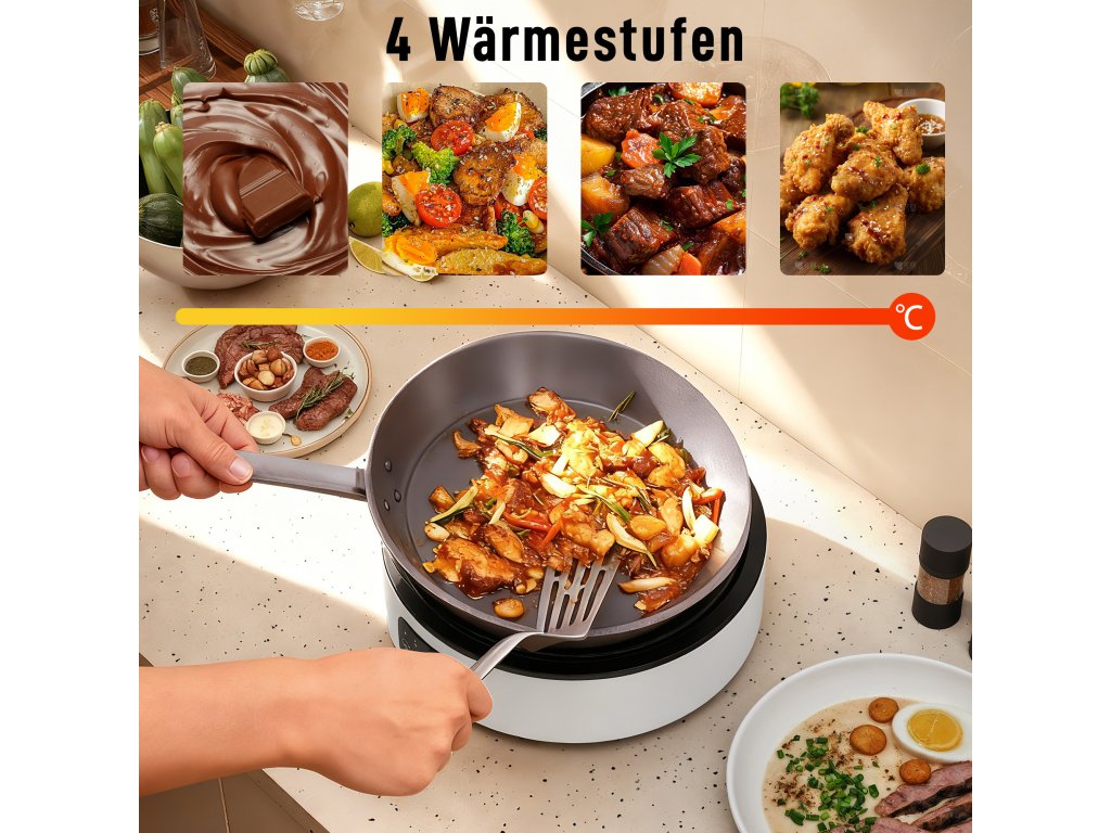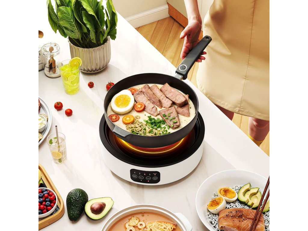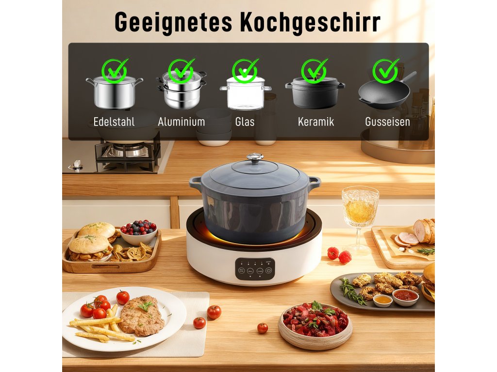 Funguje s jakoukoli pánví: Není potřeba speciální nádobí – tato infračervená elektrická varná deska je kompatibilní s pánvemi ze železa, nerezové oceli, hliníku, skla, keramiky a litiny (do dna 30 cm). Použijte své stávající nádobí a začněte ihned vařit.