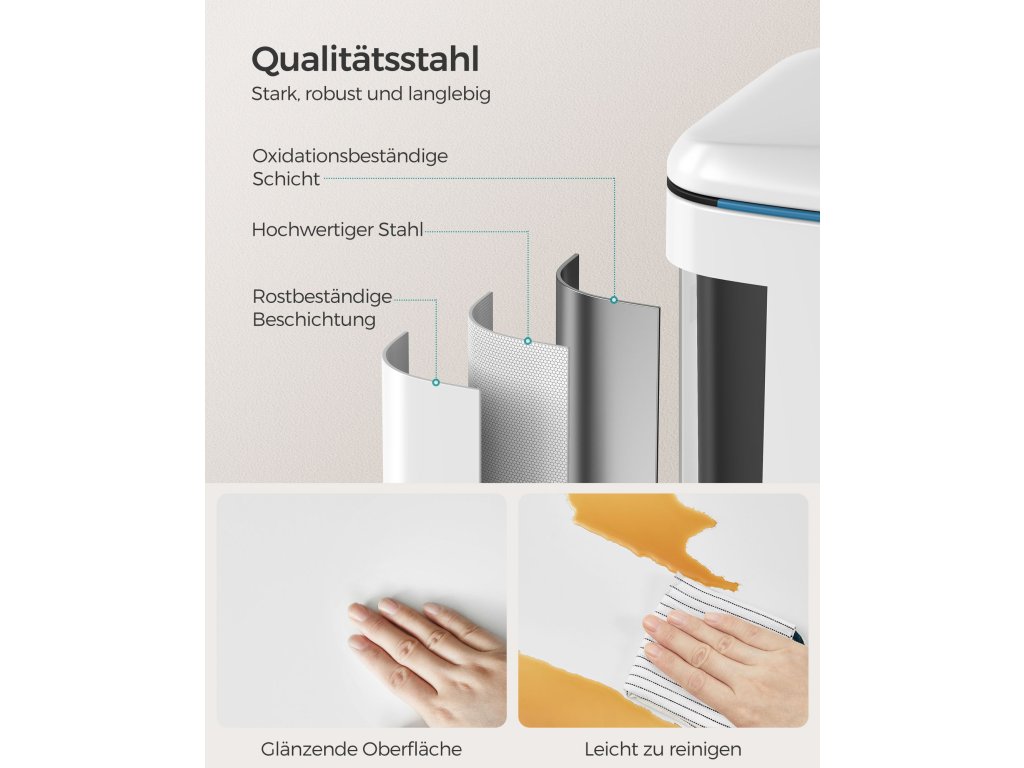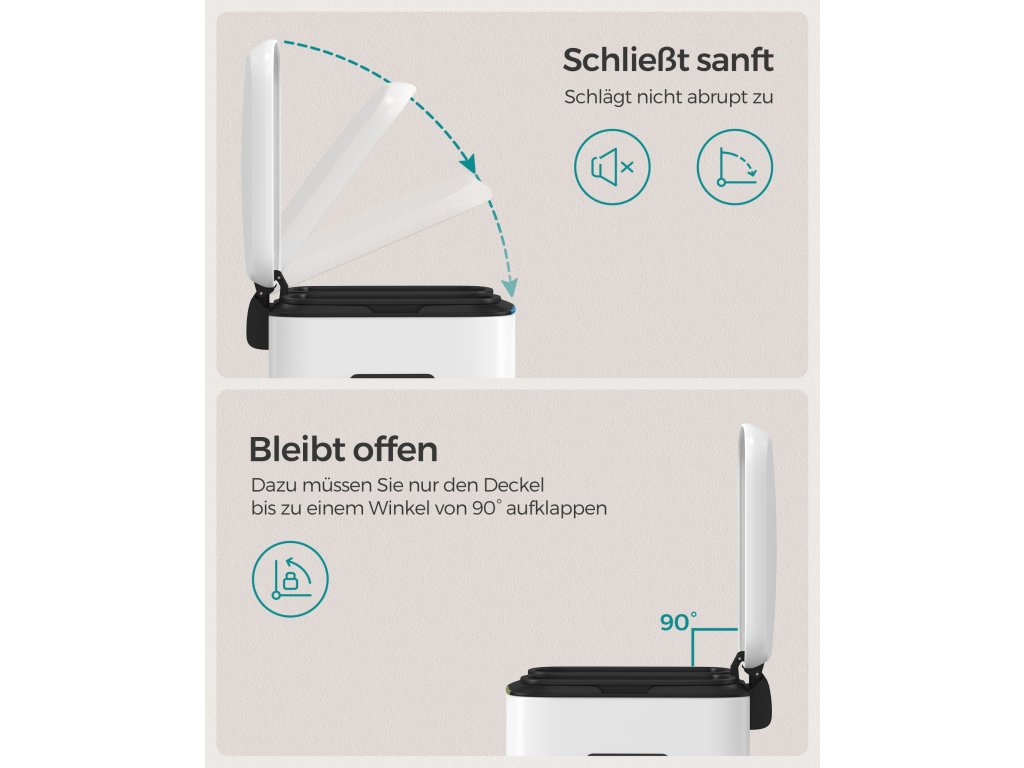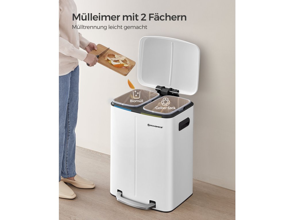 Výhoda pro vaši kuchyni: Díky elegantní bílé barvě a jednoduché siluetě bude tento odpadkový koš v kuchyni poutat pozornost.Krok pro třídění při přehazování: Tento pedálový koš má 2 sekce, díky nimž je třídění recyklovatelných odpadů hračka; nejlepší na tom je, že to lze provést, aniž byste se koše dotkli.Má to i měkkou stránku: Přestože je vyroben z pevného kovu, je šetrný - díky tlumicímu mechanismu se víko zavírá jemně, pomalu a tiše, bez hlasitého řinčení.Kbelík v koši: Tento odpadkový koš obsahuje 2 kbelíky s výřezem na zadní straně pro pohodlnou výměnu pytle na odpadky; pokud se sáček náhodou rozbije a vylije, stačí vyjmout kbelíky a snadno je vyčistit;Pro pohodlný život: Tento pedálový koš, který se díky tlumicímu mechanismu zavírá tiše, si můžete dopřát. Chcete se zbavit odpadu? Stačí sešlápnout pedál a hodit ho do kbelíku - čistý domov, pohodlné bydlení!.| Kategorie: | Odpadkové koše |