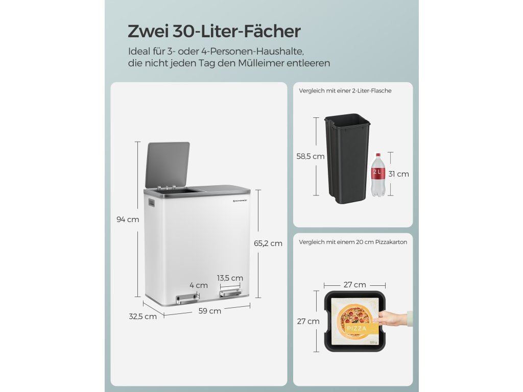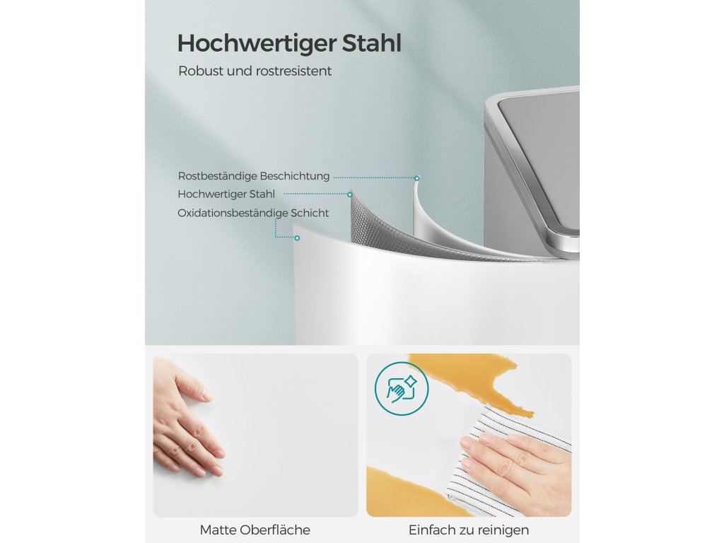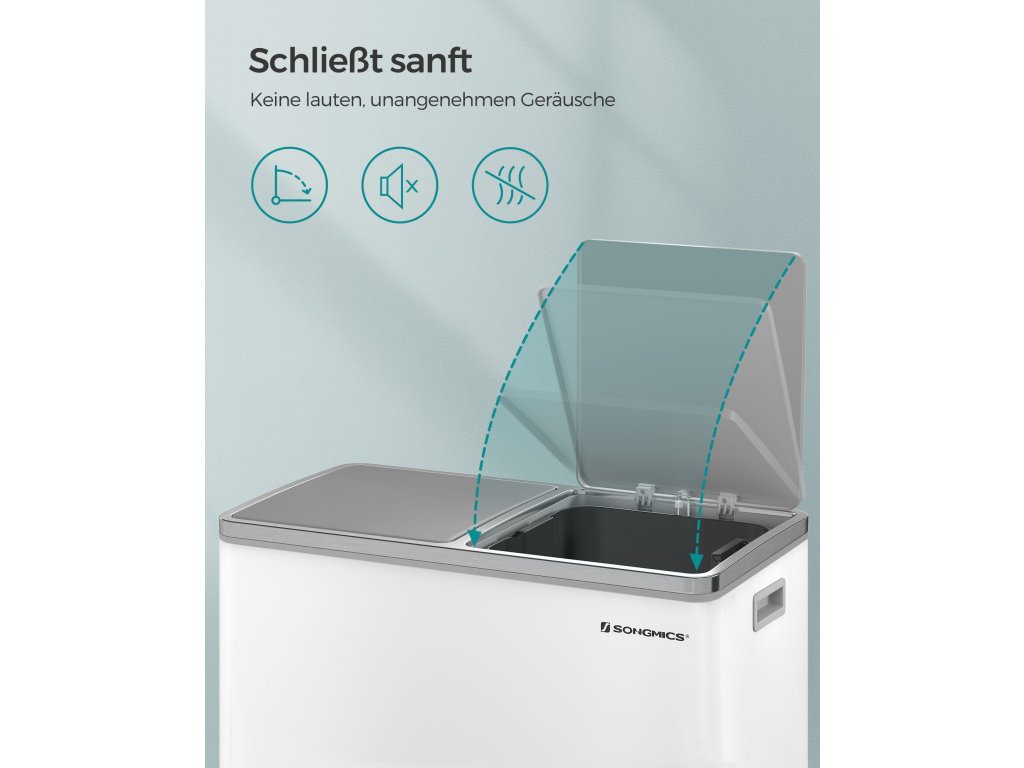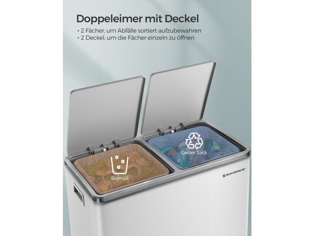 Výhoda pro vaši kuchyni: Díky elegantním bílým a stříbrným barvám a jednoduché siluetě bude tento odpadkový koš ve vaší kuchyni poutat pozornost.Krok pro třídění při přehazování: Tento pedálový koš má 2 sekce, díky nimž je třídění recyklovatelných odpadů hračka; nejlepší na tom je, že to lze provést, aniž byste se koše dotkli.Má to i měkkou stránku: Přestože je vyroben z pevného kovu, je šetrný - díky tlumicímu mechanismu se víka zavírají jemně, pomalu a tiše. udržuje zápach na uzdě bez hlasitého řinčení.Kbelík v koši: Tento odpadkový koš obsahuje 2 vyjímatelné kbelíky pro snadné čištění, pokud se pytel na odpadky náhodou rozbije a vysype; kbelíky jsou opatřeny praktickými kovovými úchyty, takže je můžete zvednout.Co získáte: Dvojitý odpadkový koš se dvěma 30litrovými koši, 15 pytli na odpadky, plastovými vnitřními kbelíky a měkkým uzavíracím mechanismem pro snadnou likvidaci odpadu.| Kategorie: | Odpadkové koše |