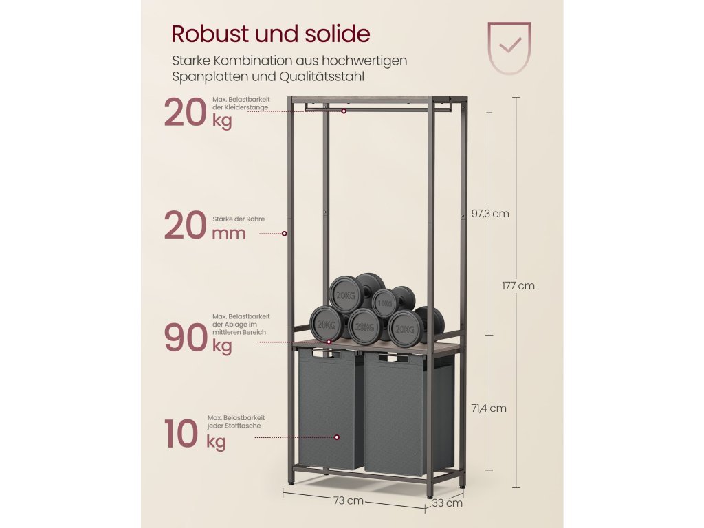 Robustní a stabilní Tento koš na prádlo je vyroben z 0,8palcových ocelových trubek a 0,8palcových dřevotřískových desek, takže prostřední police unese až 200 kilogramů. Je také vybaven nastavitelnými nohami pro stabilitu na mírně nerovných podlahách a sadou proti převrácení pro větší bezpečnost. Odnímatelné a vodoodpudivé vložky: Díky suchým zipům lze tyto vložky snadno vyjmout a odnést do pračky. Tyto vložky jsou vyrobeny z kvalitní tkaniny Oxford a jsou vodoodpudivé, takže se snadno čistí a mají dlouhou životnost.| Kategorie: | Koše na prádlo |