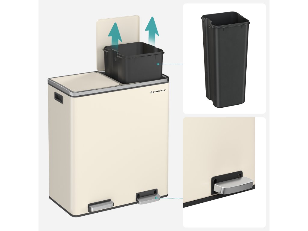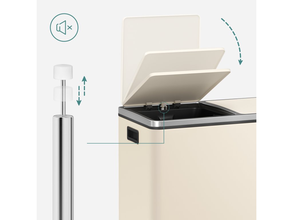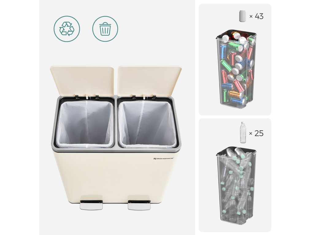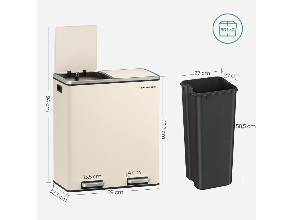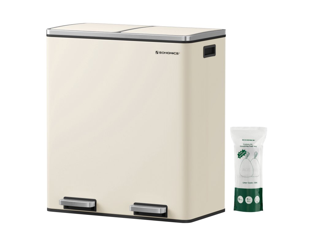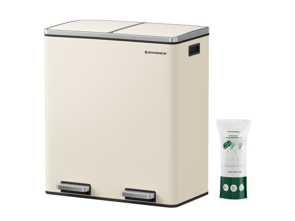 Dvoukomorový odpadkový koš 2 x 30 l se 2 pytli na odpadky, kovové nášlapné pedály, víka, madla, měkké zavírání, vzduchotěsný, krémový.