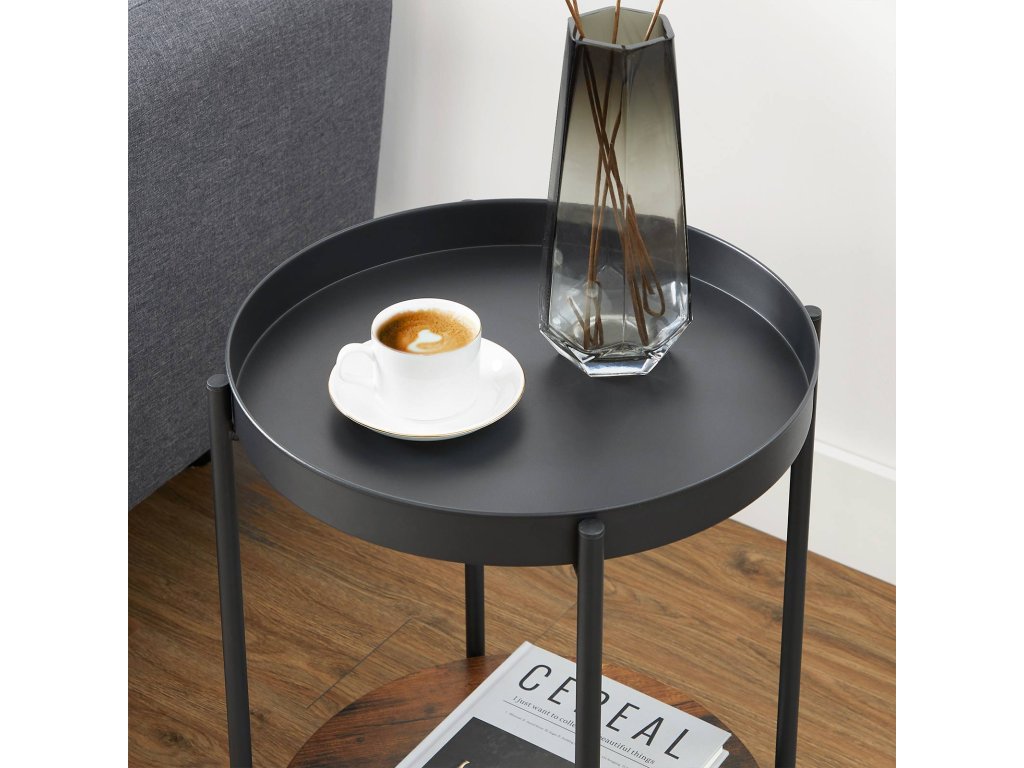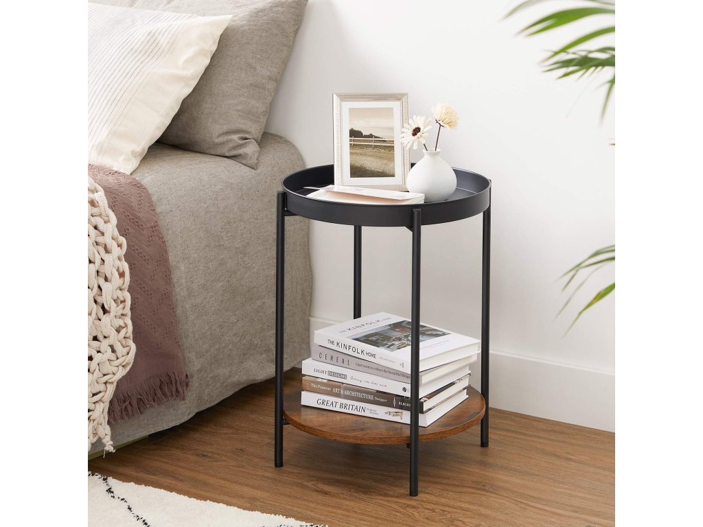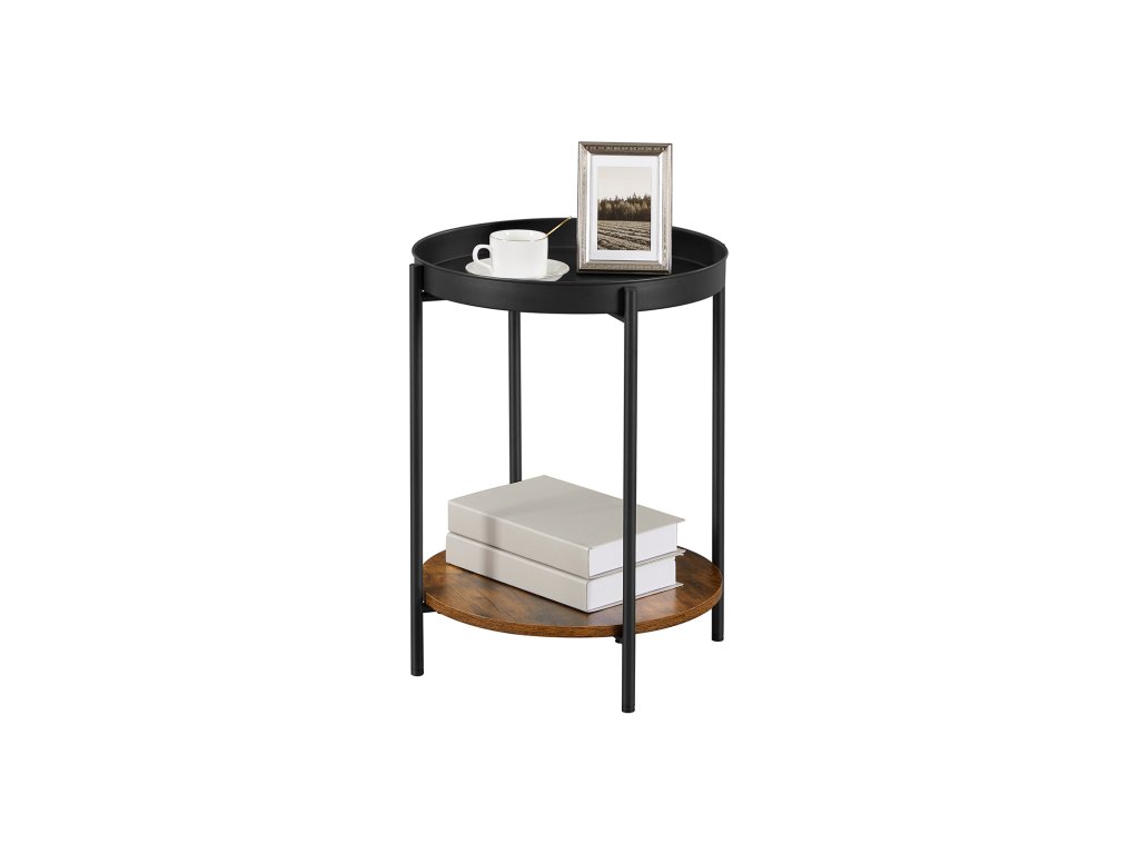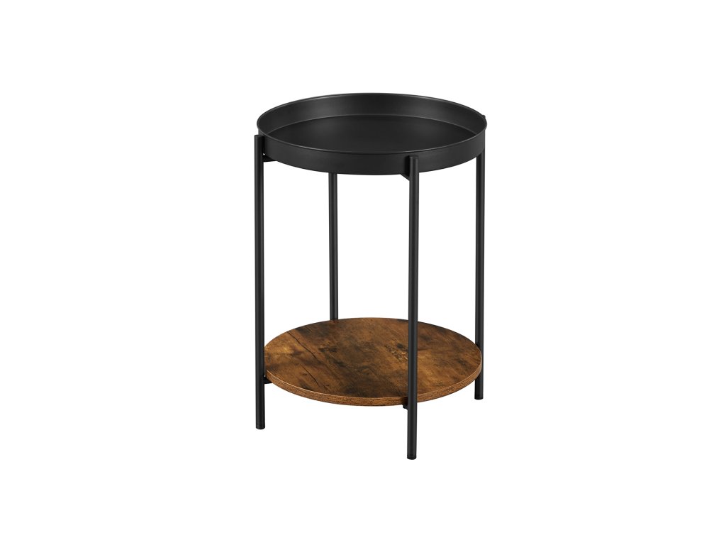 Naštěstí jste ho našli! Postranní stolek, který vám pomůže realizovat váš vysněný obývací pokoj a který v sobě spojuje eleganci, jednoduchost a kreativitu - podpořený černým ocelovým rámem. nahoře leží kulatý tác a dole hnědá rustikální police.