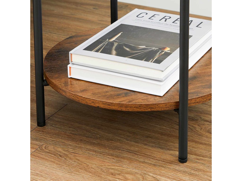 Dvoupatrový odkládací stolek, konferenční stolek s pohyblivou deskou, ocelový rám, do obývacího pokoje, ložnice, rustikální hnědá a černá.