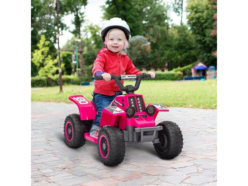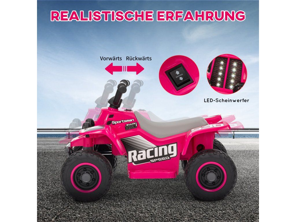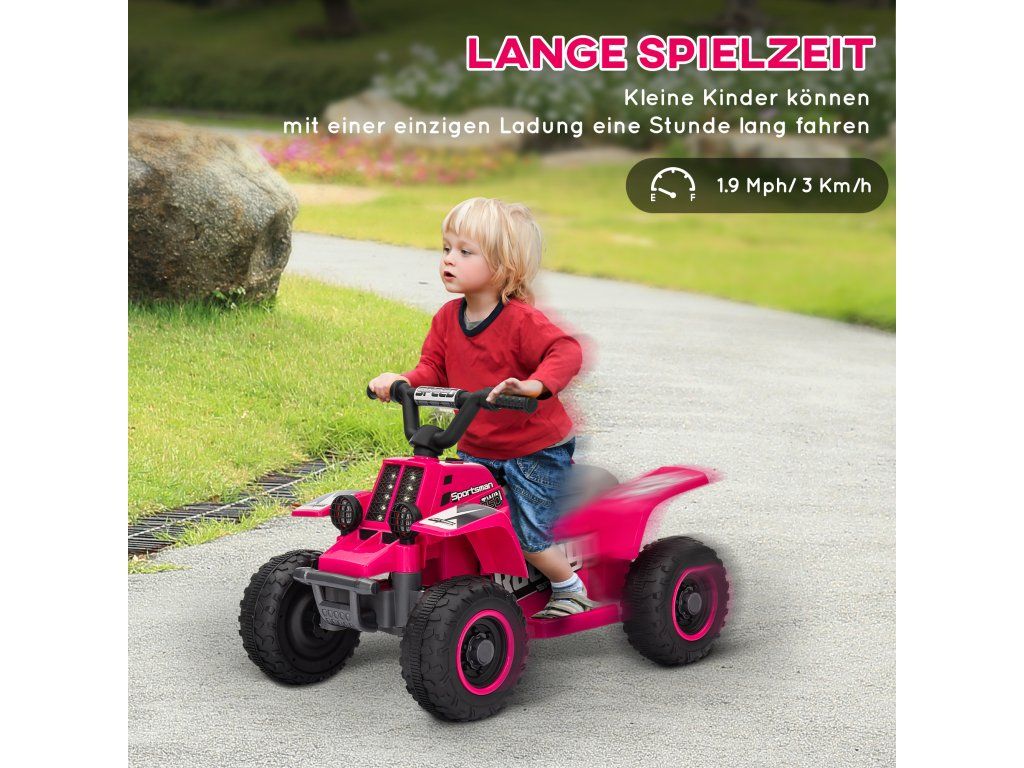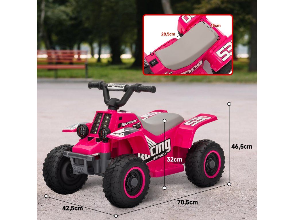 S čtyřkolkou si vaše děti zažijí ryzí zábavu z jízdy! Toto elektrické vozidlo vhodné pro děti má 6V motor a dosahuje bezpečné rychlosti 3 km/h vpřed i vzad. Jasné LED světlomety zajišťují dobrou viditelnost a zaručují vzrušující jízdy na různých površích, ať už asfaltu nebo betonu. Tato čtyřkolka je ideální pro mladé jezdce ve věku 18–36 měsíců a zaručuje perfektní start do nesčetných dobrodružství!