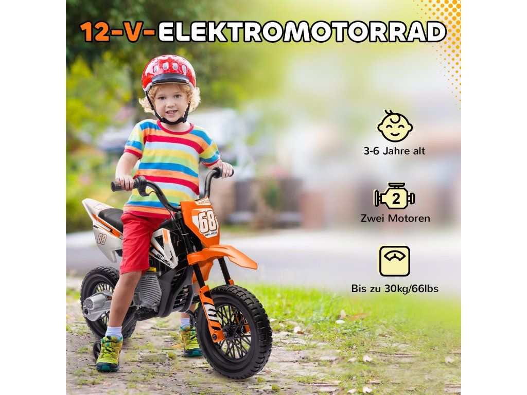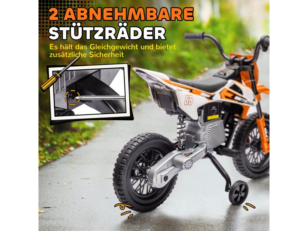 Prozkoumejte okolí s dětskou motorkou, která je vybavena manuálním ovládáním plynu pro rychlosti mezi 2,4 a 5 km/h. Je ideální pro malé motorkáře a obsahuje pomocná kolečka pro nepřetržitou zábavu. Užijte si vestavěnou hudbu a plynulou jízdu na různých površích díky tlumícím zadním kolům elektrické motorky. Vzrušující hračka pro malé objevitele!