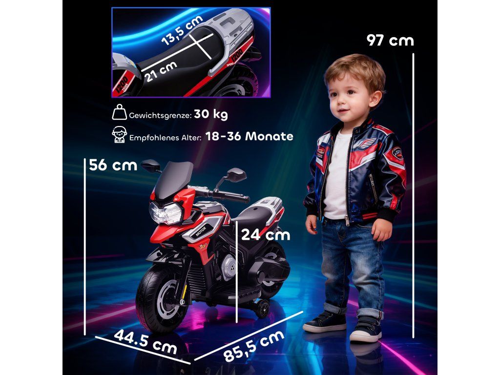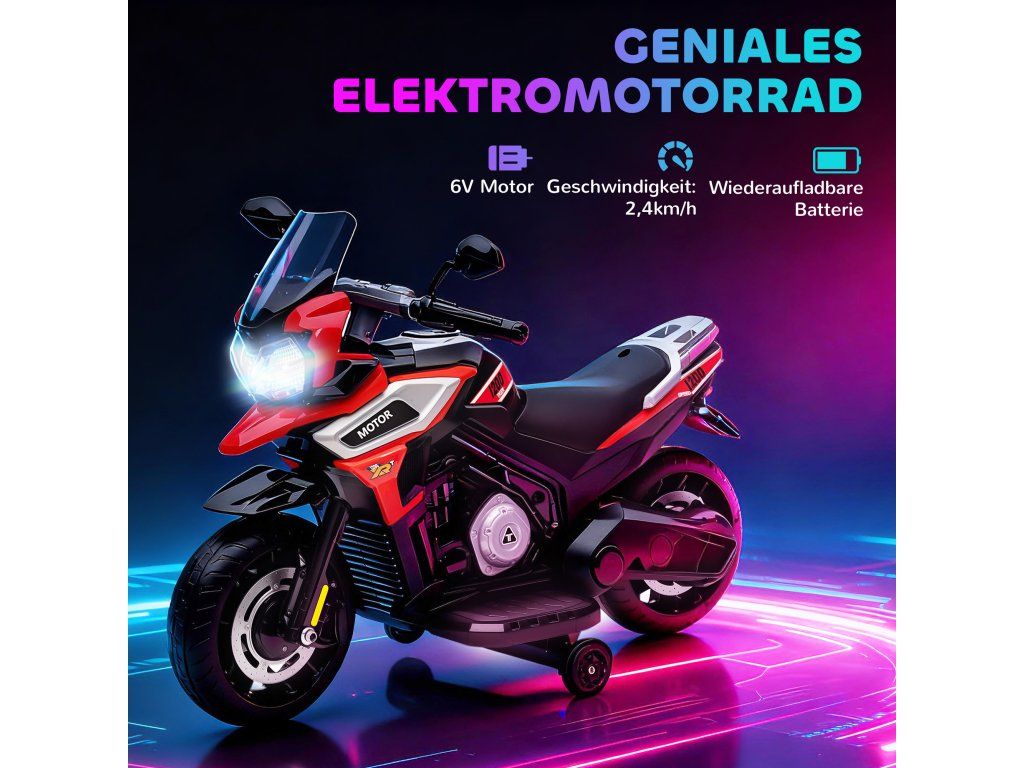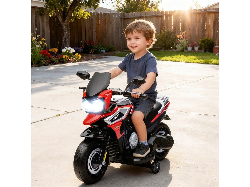 Dopřejte svému batoleti vzrušující dobrodružství s tímto elektrickým motocyklem, který je vyroben podle vzoru skutečných motocyklů s blatníky a zpětnými zrcátky. Nabízí spolehlivou jízdu rychlostí 2,4 km/h, plynulé zrychlení a odnímatelná pomocná kolečka pro větší bezpečnost. Konstrukce z plastu a kovu zajišťuje odolnost. Jasné světlomety a vestavěná hudba umocňují zábavu, což z něj činí ideální dárek pro dobrodružné batolata.