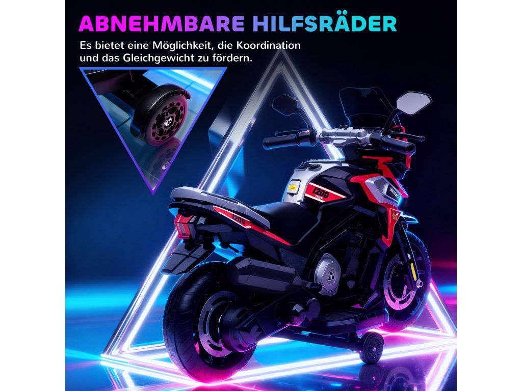 Bezpečná a plynulá jízda: Tato dětská elektrická motorka je vybavena funkcí pozvolného startu. Dvě odnímatelná pomocná kolečka zajišťují rovnováhu na rovném povrchu a zkušenější děti si je mohou sundat pro lepší zážitek z jízdy.