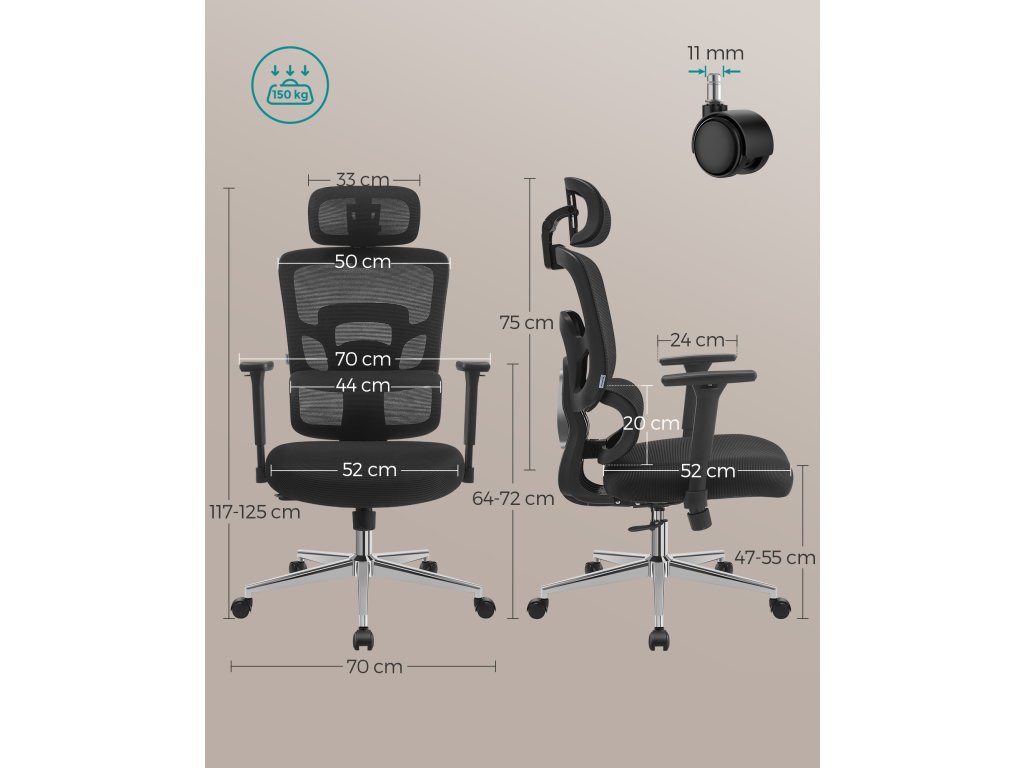 ERGONOMICKÁ PODPORA Bederní opěrku lze nastavit nahoru nebo dolů o 6 cm, aby vyhovovala vašim preferencím při sezení. Opěradlo lze nastavit v úhlech 90°, 115° a 135°, aby se dokonale přizpůsobilo vašemu tělu.PRAKTICKÁ OPĚRKA HLAVY S opěrkou hlavy, kterou lze výškově nastavit o 6 cm a úhlově o 65°, a s tlačítkem pro nastavení většího úhlu. tato židle nabízí individuální opěrku hlavy a krku pro uživatele různých velikostí.3D PODRUČKY Područky této židle lze výškově nastavit o 7 cm, posunout dopředu a dozadu o 5 cm a otočit o 30°, takže vaše ruce budou dobře podepřené ve všech polohách.VERSATILNÍ POHODLÍ Díky prodyšnému síťovanému opěradlu a pohodlně polstrovanému polštáři můžete na této počítačové židli zapomenout na únavu z dlouhého sezení. Ideální do kanceláře, konferenční místnosti i domácnosti.BEZPEČNOST A STABILITA S plynovou tlakovou lahví, která prošla bezpečnostní zkouškou TÜV Rheinland se 120 000 cykly (číslo certifikátu: SHI50037001, vlastník: dodavatel). tato kancelářská židle unese až 150 kg a nabízí bezpečnou nosnost.| Kategorie: | Kancelářské židle |