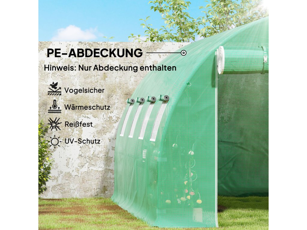 S tímto krytem skleníku můžete pokračovat v pěstování rostlin, i když je starý kryt poškozený. Je vyroben z PE síťoviny, která chrání vaše rostliny před lehkým deštěm, větrem a přímým slunečním zářením. Spodní okraj je po celém obvodu dlouhý 15 cm, což poskytuje prostor pro další závaží, která kryt udrží na místě. Osm rolovacích oken zajišťuje cirkulaci vzduchu a velké dveře na zip usnadňují přístup.