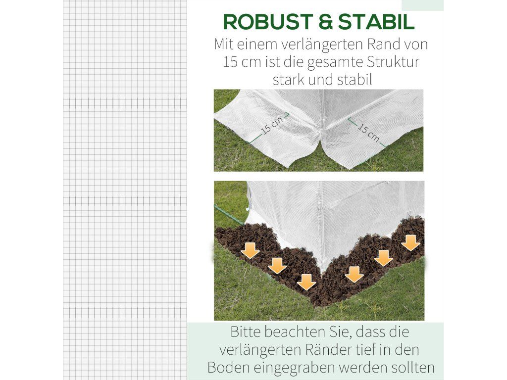 Zvýšená stabilita: Vybaven 15 cm prodlouženým okrajem, který je zapuštěn do země pro trvalou stabilizaci konstrukce krytu na skleník na rajčata.