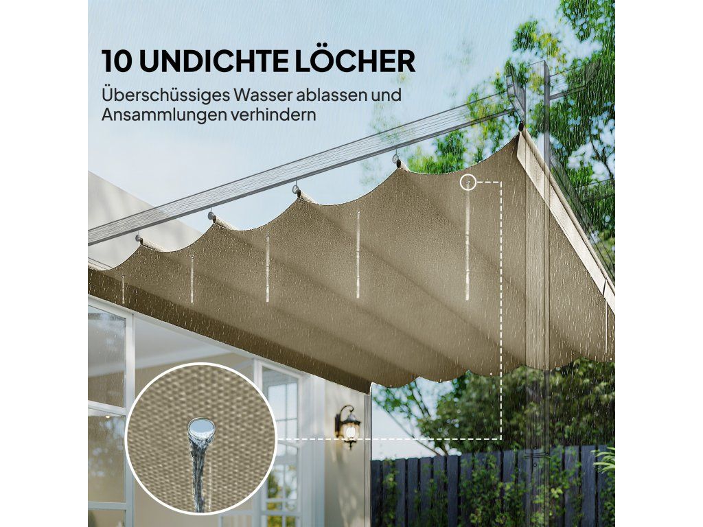Dokonalý odvod dešťové vody: Tato přizpůsobivá náhradní stříška na pergolu má 10 otvorů, které účinně odvádějí přebytečnou vodu a zabraňují hromadění a nadměrnému namáhání.
