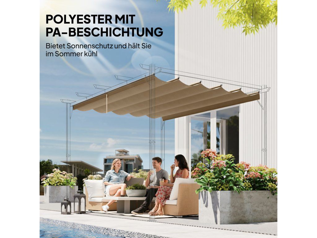 Stín a ochrana před sluncem: Účinně se chraňte před přímým slunečním zářením a užívejte si příjemně chladivý stín. Tato stříška je vyrobena z prodyšného polyesteru o gramáži 180 g/m² a zaručuje optimální cirkulaci vzduchu a vynikající ochranu před deštěm.