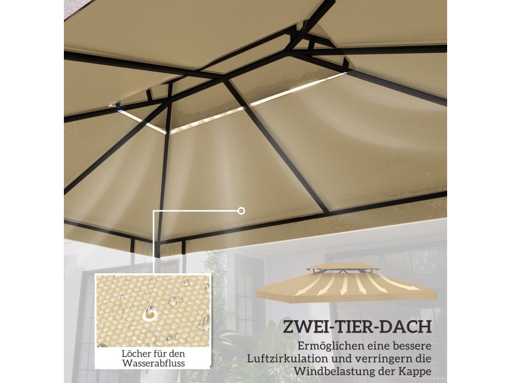 Praktická větrná clona: Zajišťuje dobré větrání. Deset drenážních otvorů v náhradní střeše altánu umožňuje odtok dešťové vody a zabraňuje jejímu hromadění.