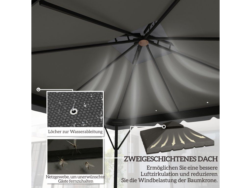 Dvouvrstvá střecha: Dvouvrstvá konstrukce střechy altánu zlepšuje cirkulaci vzduchu a stabilitu proti větru. Síťovaná tkanina chrání před hmyzem, zatímco dvoubarevný design stylově vylepší vaši terasu nebo zahradu.