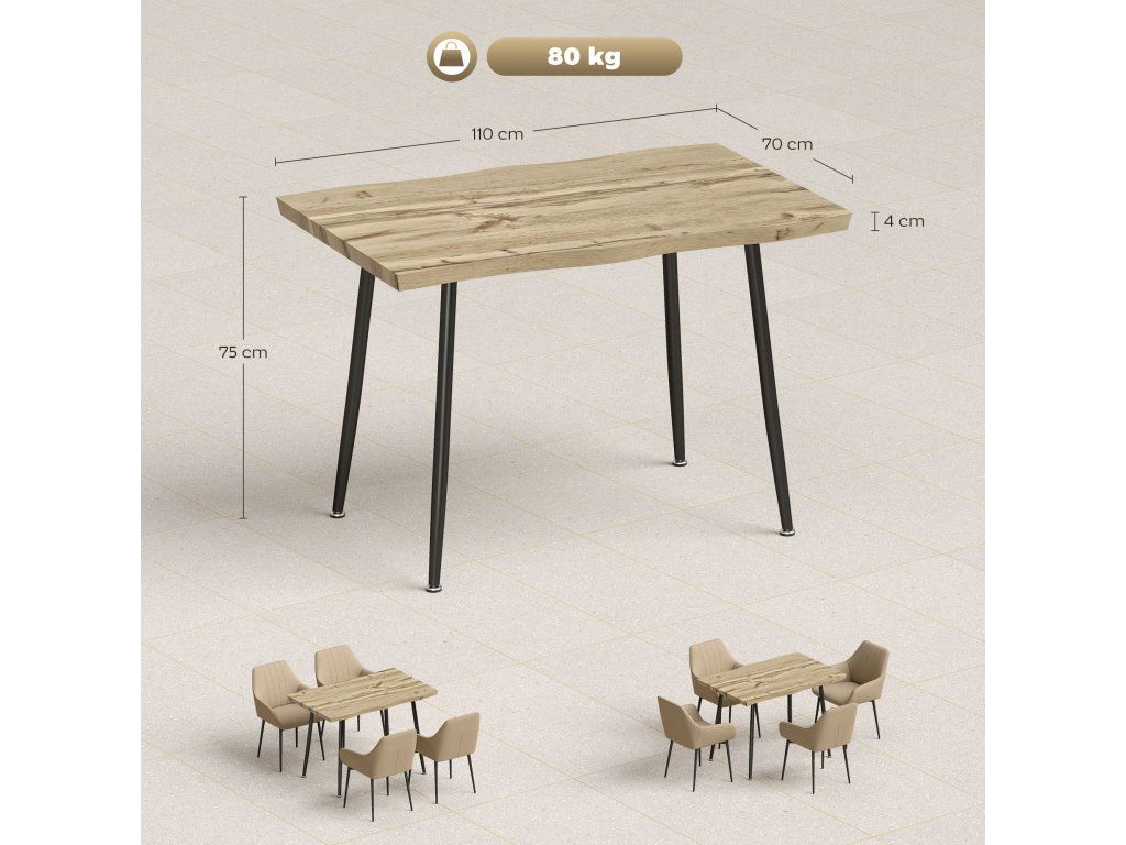 Rodinná velikost pro každodenní použití: Tento jídelní stůl s rozměry 110 x 70 x 75 cm pohodlně pojme čtyři osoby. Perfektně se hodí do kuchyní, jídelen nebo malých bytů a optimálně využívá dostupný prostor.